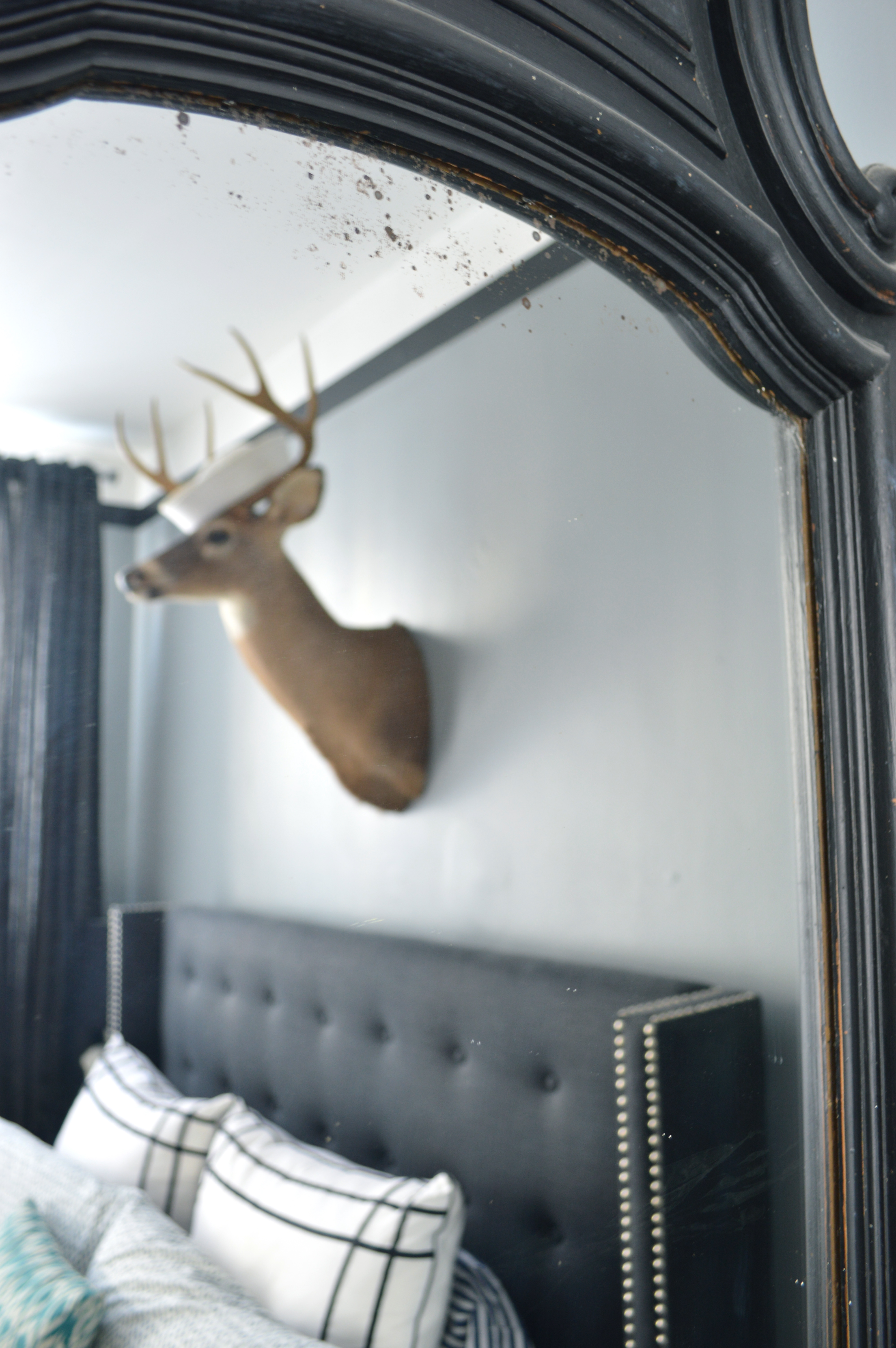 Hunting is big in my family and, while I’m not a hunter myself, I do enjoy some taxidermy. Say hello to Barnard. Doris and Betty also wanted to say hi, so say hello to them too. The chandelier was painted white when I bought it but I thought our bedroom could use some color so I picked up a can of spray paint and went to town. Hot pink town.