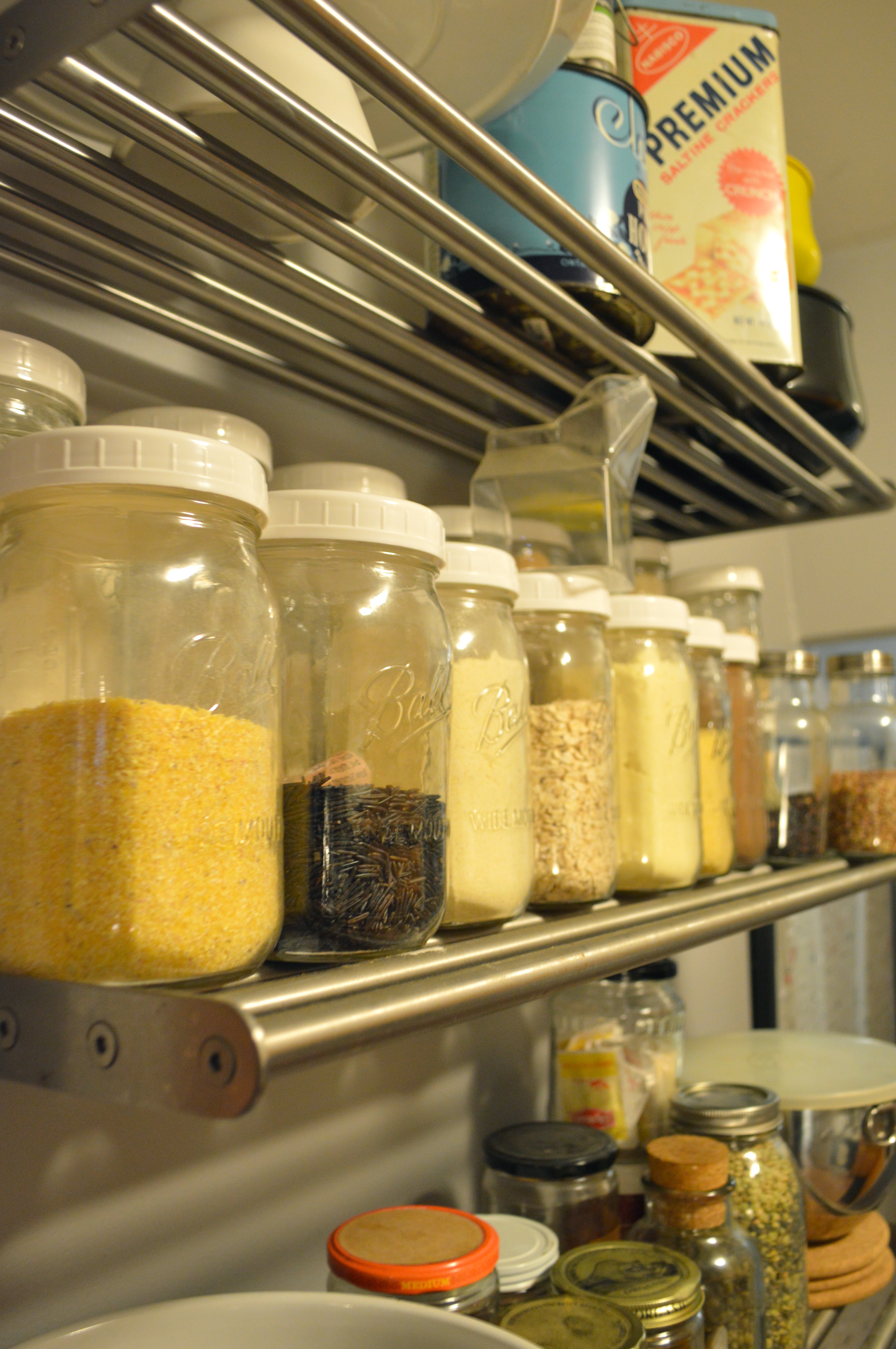 ball jar dry storage in the kitchen | Brooklyn Homemakershelving and storage cart in the kitchen | Brooklyn Homemaker