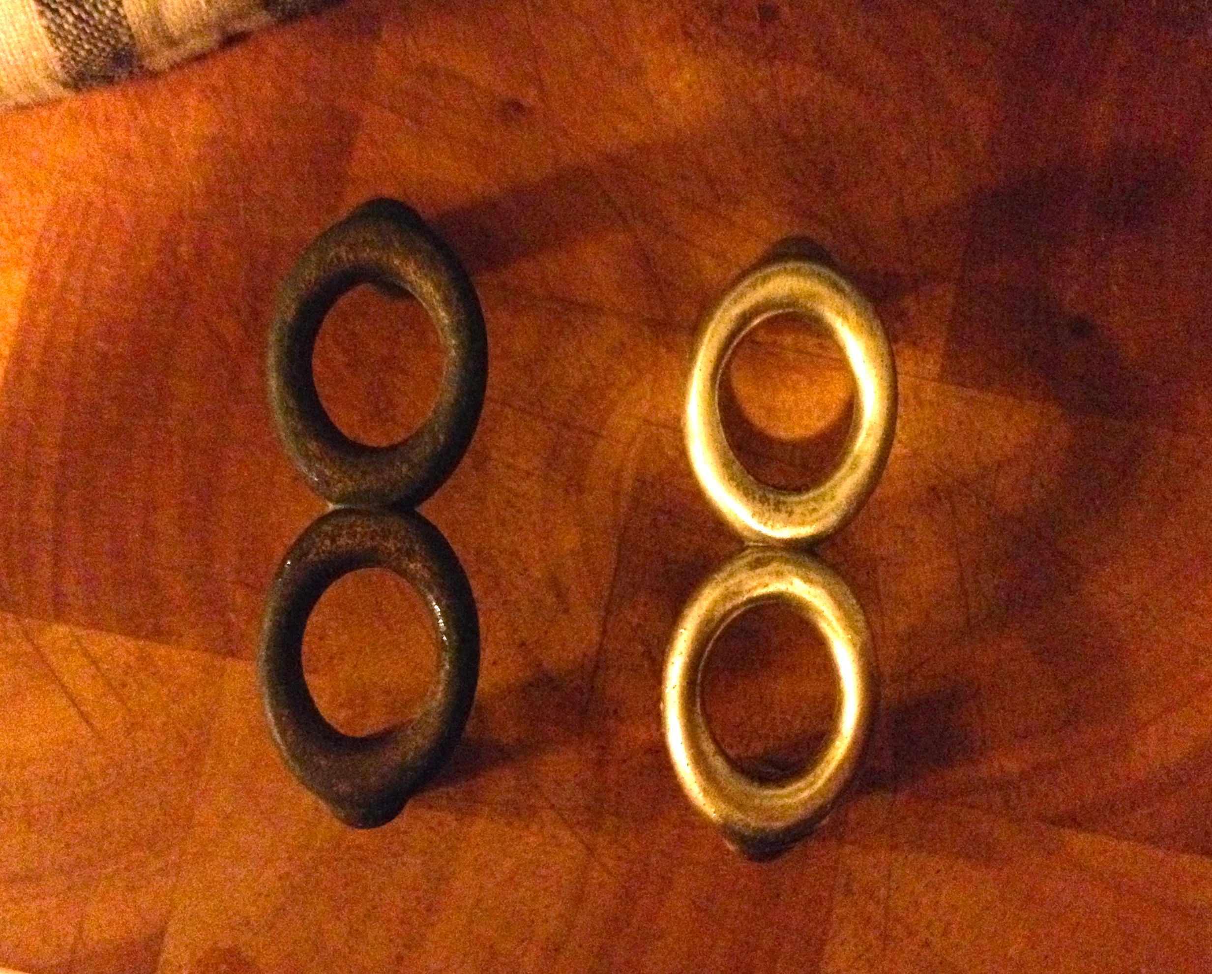The mid-century end tables were found at Junk in Williamsburg. They were in kind of rough shape when we found them but were cheap so we didn’t mind giving them a little love to bring them back to life. Refurbishing them could have been another post, but this happened before Brooklyn Homemaker and I didn’t think to get any good photos of that process. I basically followed the steps as laid out over at Manhattan Nest, and once I had the materials it was actually fairly easy and made such a difference in making those old tables shine. The one decent photo I did manage to get was of the brass handles, and what they looked like before and after cleaning them with Brasso. It turns out that the main ingredient in Brasso is magic. Behold: