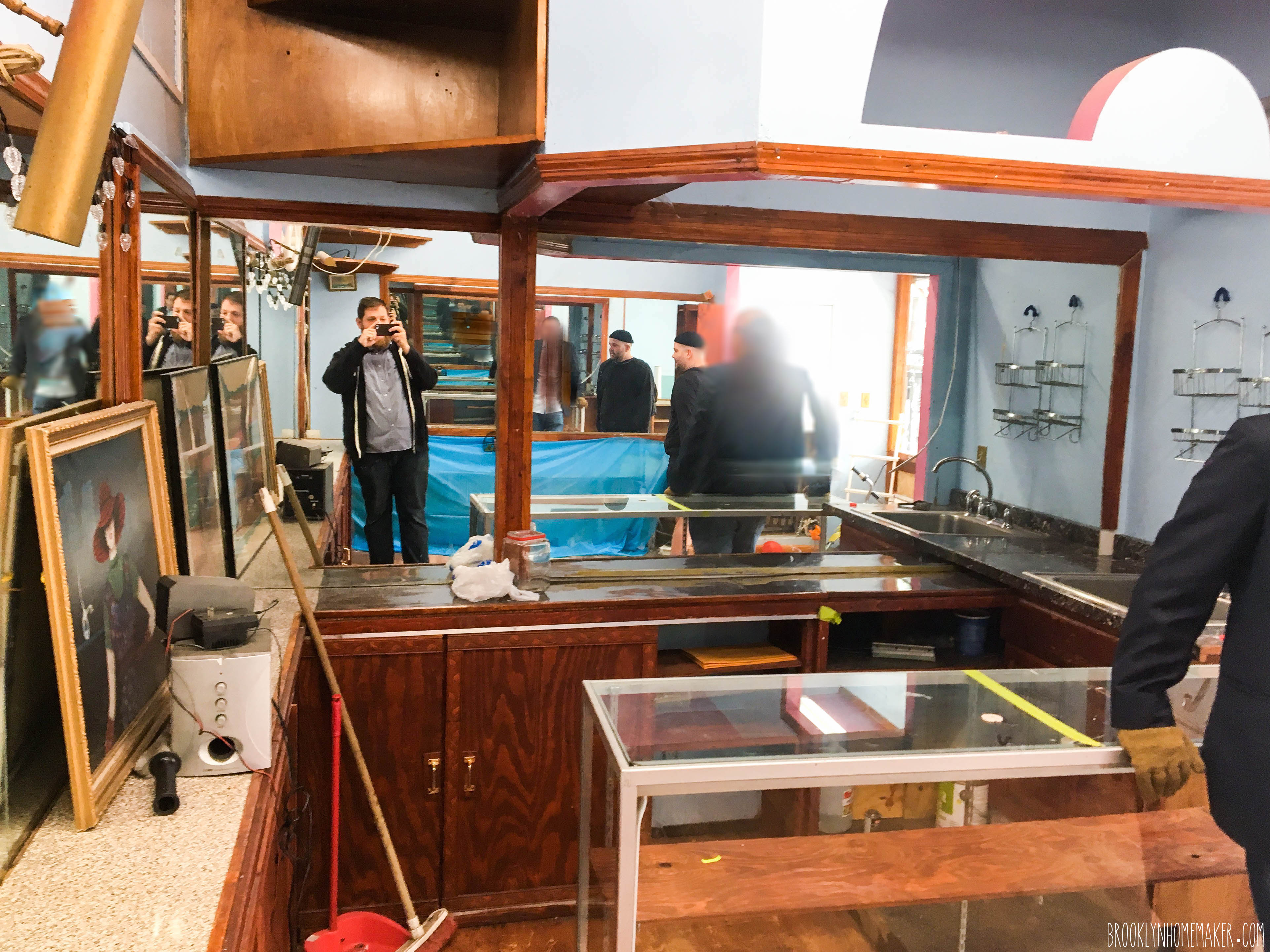 In the following 24 hours we both flipped positions for and against the idea multiple times. Ever the realist, I was against it at first. It was too much work, it would be too expensive, and we had no significant savings to speak of. Russell was all for it. It was so close, so affordable, and was such a perfect (small) size for his first shop on his own. He called a friend of his who specializes in commercial real estate in Manhattan, told her about the shape the space was in, and I could sense that he was beginning to realize that we might be in over our heads with this place. Oddly enough, as reality was setting in for Russell, my imagination was beginning to run wild. I’m a handy guy. I love DIY projects, and this would (eventually) be the ultimate blank slate for me to put my touch on. What was left of the drywall was in rough shape under the crappy crumbling cabinets and cheap chippy mirrors, but that wasn’t anything a little white subway tile and a splash of hutzpah couldn’t fix. Was it?