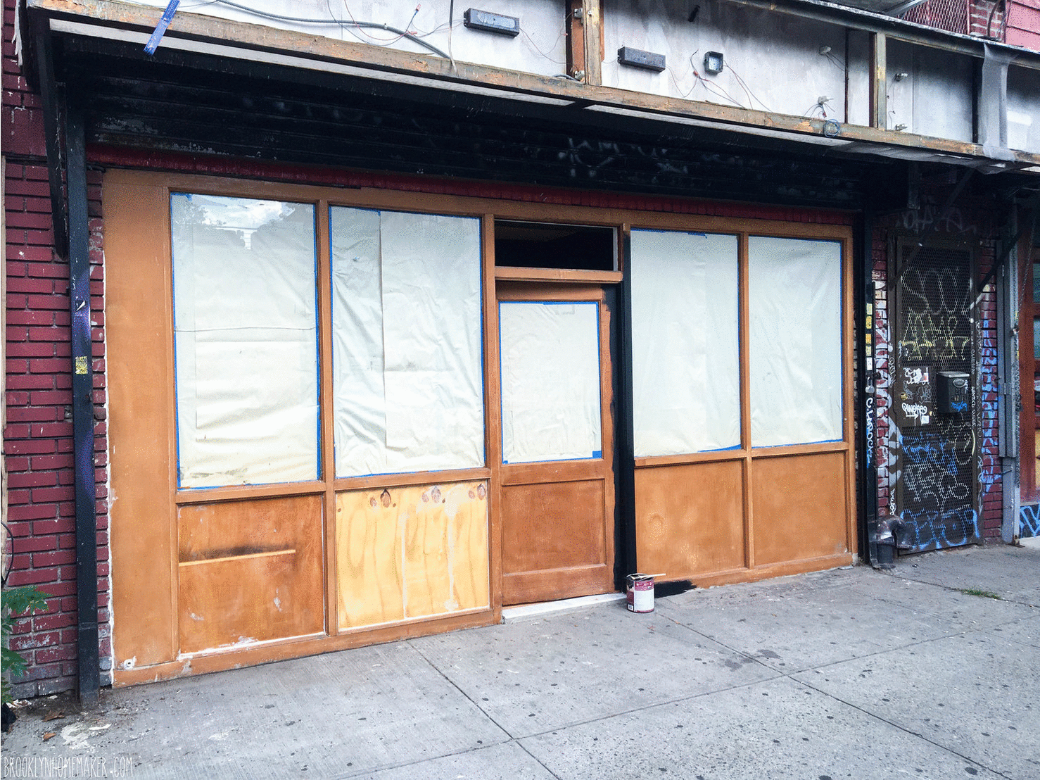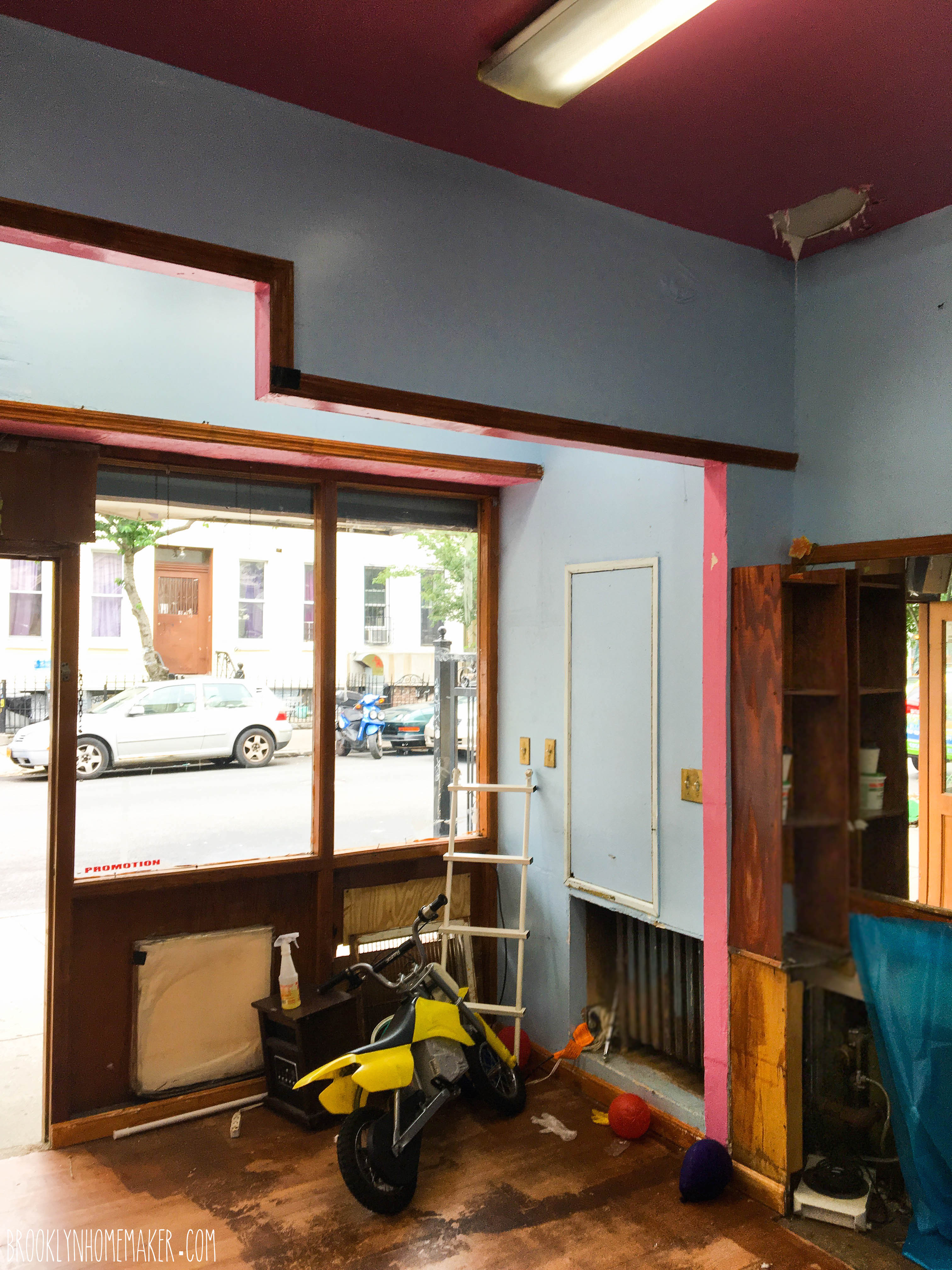 We saw it, took some photos, and told the agent we’d get back to him if we were still interested. We tried to play it cool but we were both wrecks. The space required soooo much more work than we had originally anticipated and we didn’t know if we could afford it or handle making it happen. Holes in the front facade, big chunks of missing drywall, weird blue plastic covering where the drywall had once been, and piles of whole acorns inside the framing behind said missing drywall. When we casually mentioned the acorns, the listing agent, with a completely straight face, said that they were probably just left there by the previous tenants who were probably just eating a lot of nuts before vacating the space.
