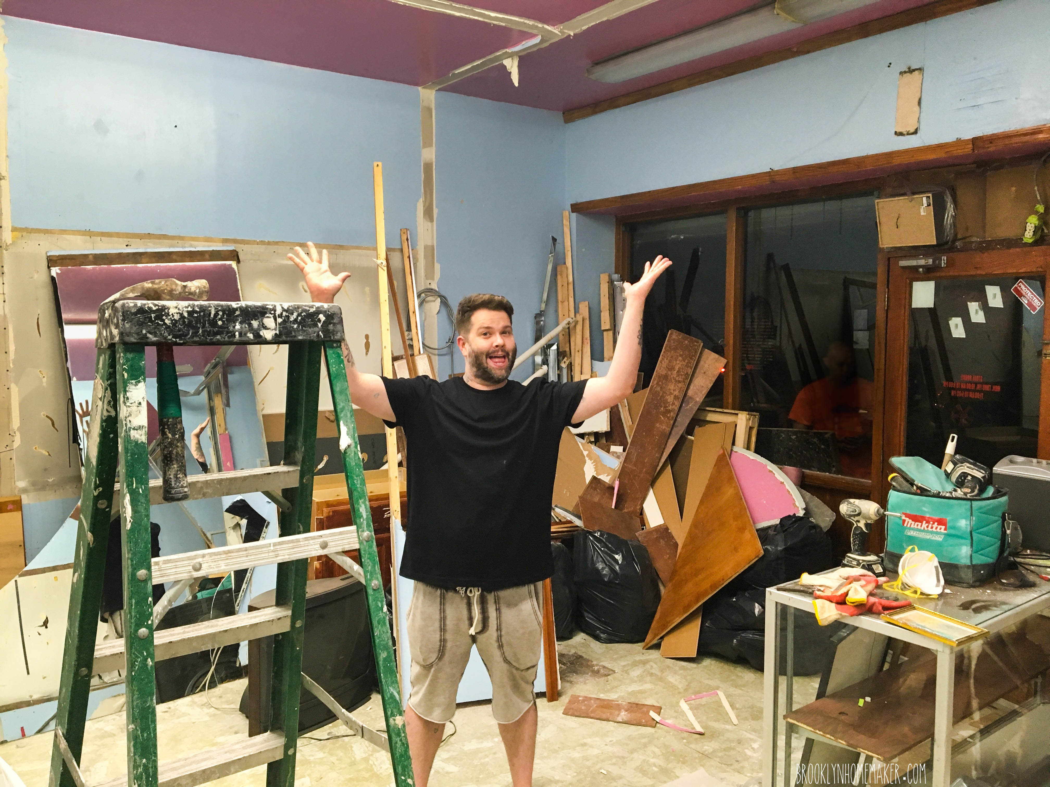Okay, so where were we? When we left off, Russell was standing with his hands in the air, a grin on his face, and a giant pile of rubble and mess behind him. Our contractor had just started demo, and the the shop was a frightful glorious mess.