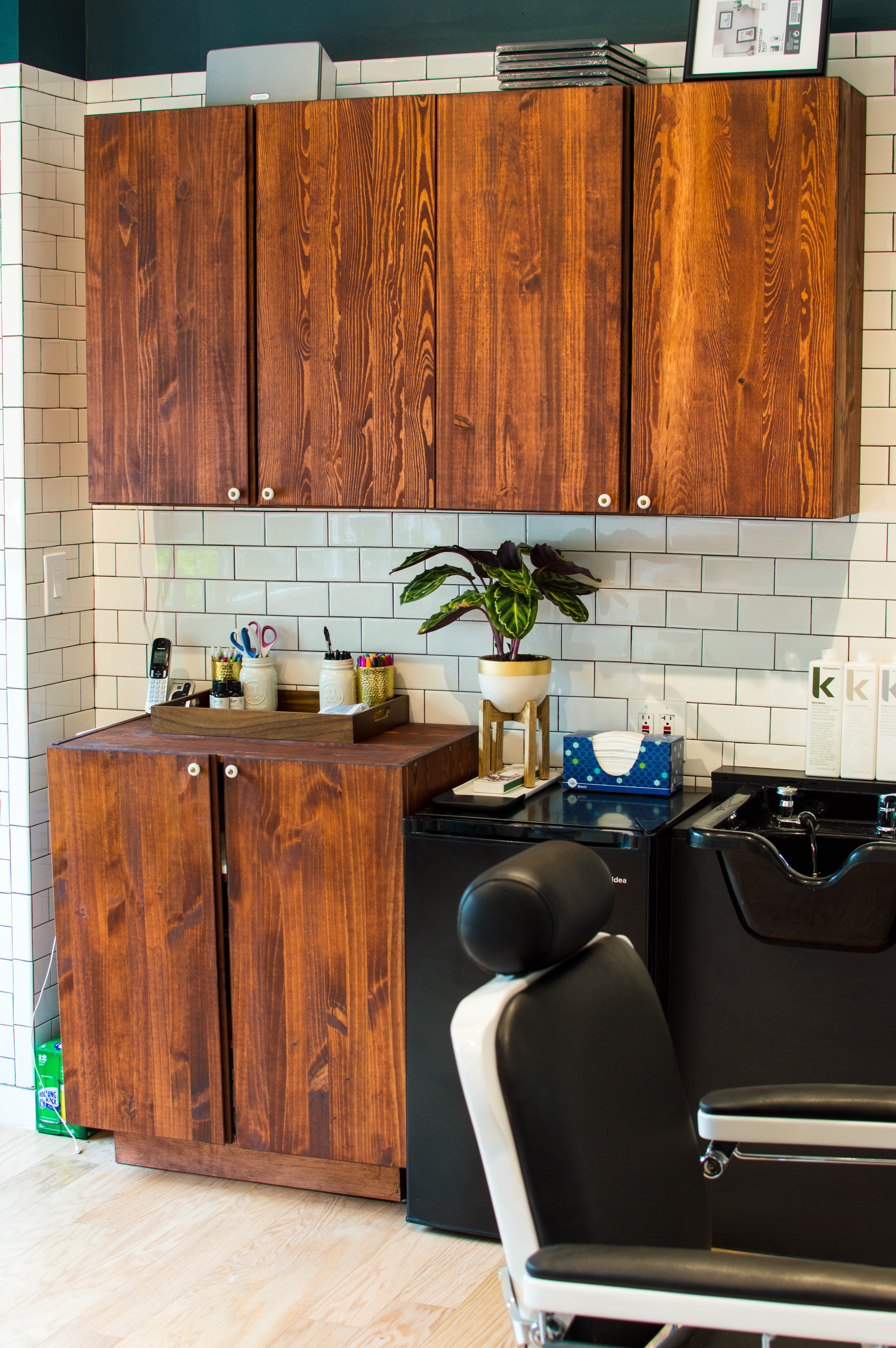 While the shop was still under construction we kept the mirrors in their original boxes, and when we tried matching the stain we only opened the box enough to reveal a section of the frame. After the cabinets and stations were stained and the mirrors were hung, we realized that the mirror’s frames are made up of many smaller pieces of wood all with their own varying tones and colors, most of which aren’t quite as red as the small section we originally used to choose our stain color. The frames overall feel a little warmer and more yellow/brown than the reddish stain we went with, but in the end the stations and cabinets still look amazing and compliment the acacia really well, so who cares?