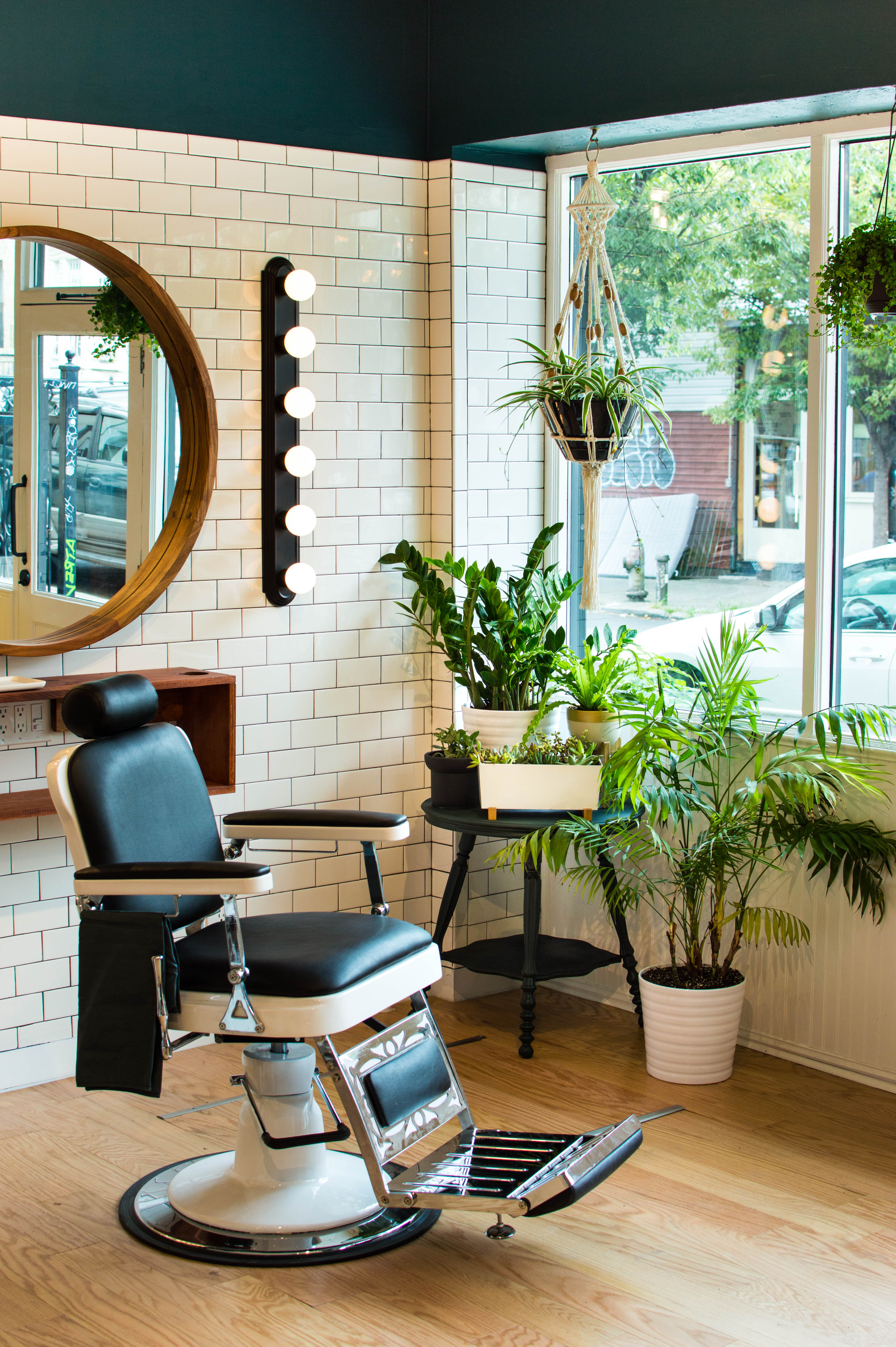 We already knew we were working with a base of white subway tile, so we decided to go for a kind of classic black and white scheme with lots of warm wood accents. Everything was being done on a tight budget, so I did A LOT of comparison shopping and bargain hunting online, and every time I’d find something I liked, I’d “pin” it and then look around for similar, cheaper options. Sometimes I found them, sometimes I didn’t. If not, we’d talk it out and decide whether it was worth a splurge or not. Our biggest splurges, the barber chairs and the huge round mirrors, ended up being the pieces that have the biggest visual impact in the pace, which is why we decided they were worth the money.