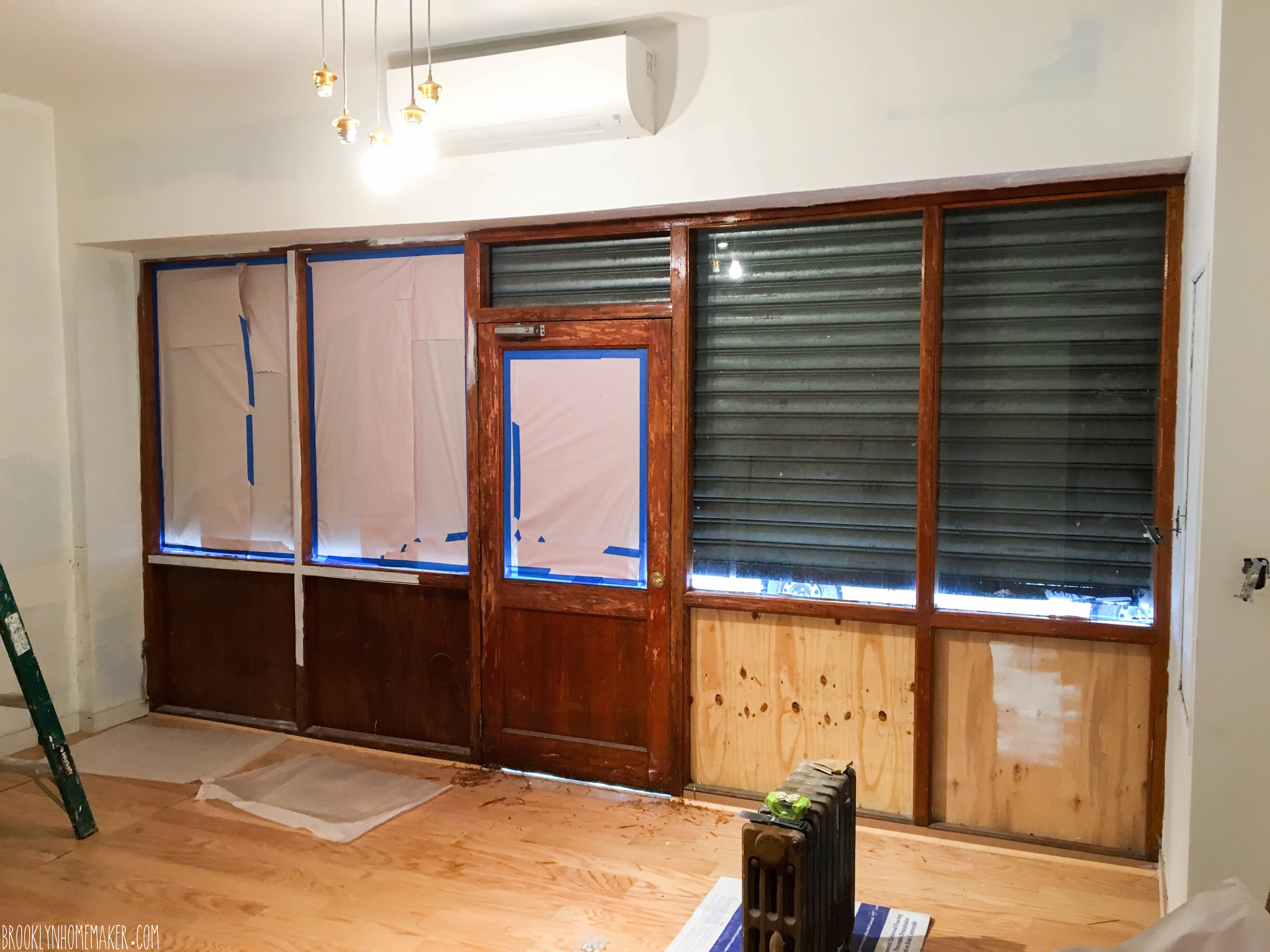 When we first saw the space we noticed that the entire front wall was strangely slapped together and incredibly poorly insulated. It consisted of little more than wood framing holding up single panes of glass above, with thin single panels of wood covering the facade below.