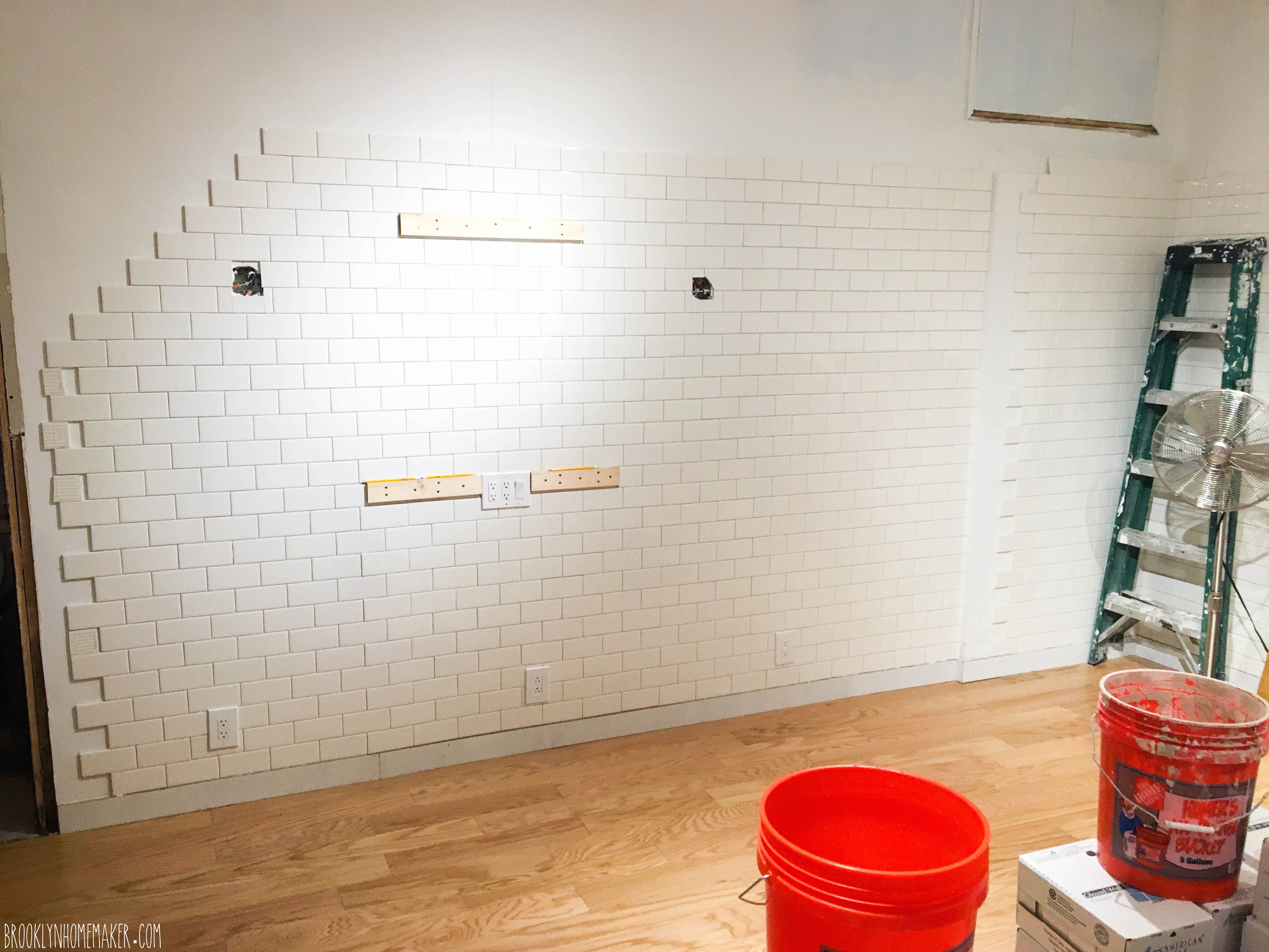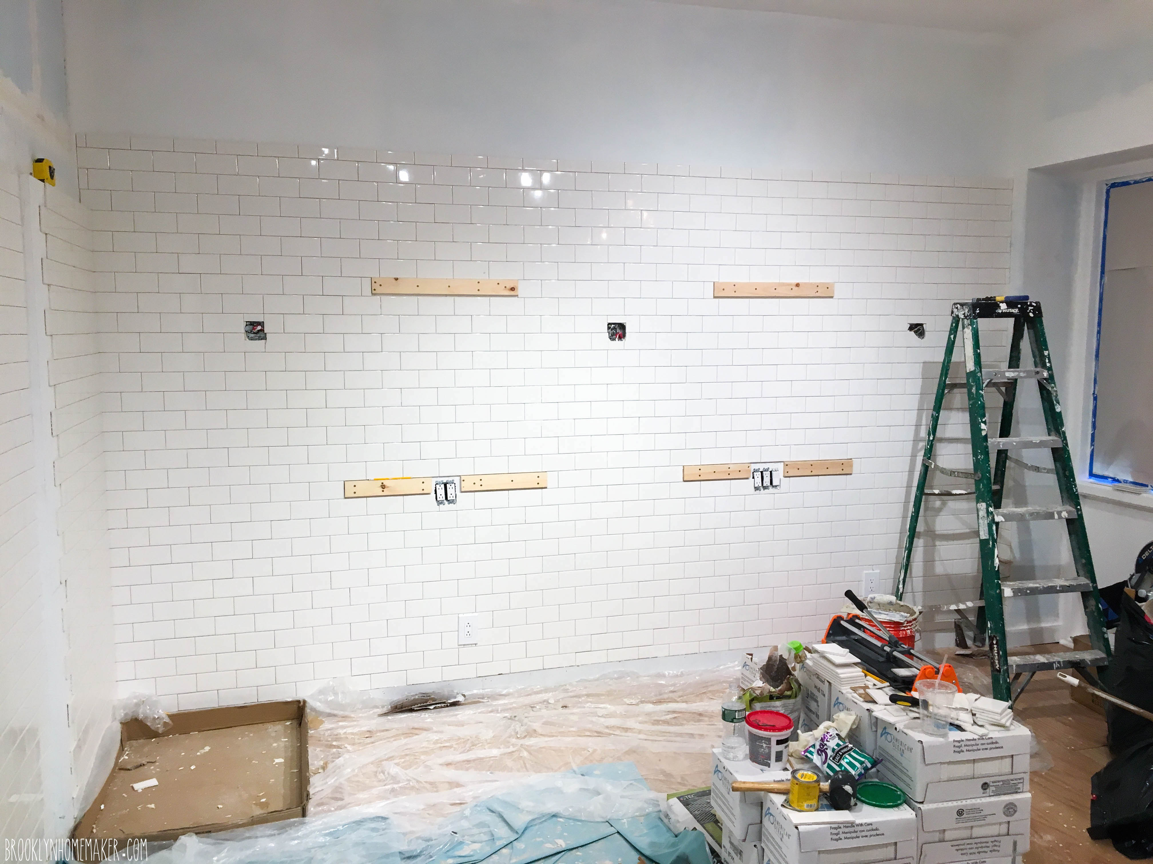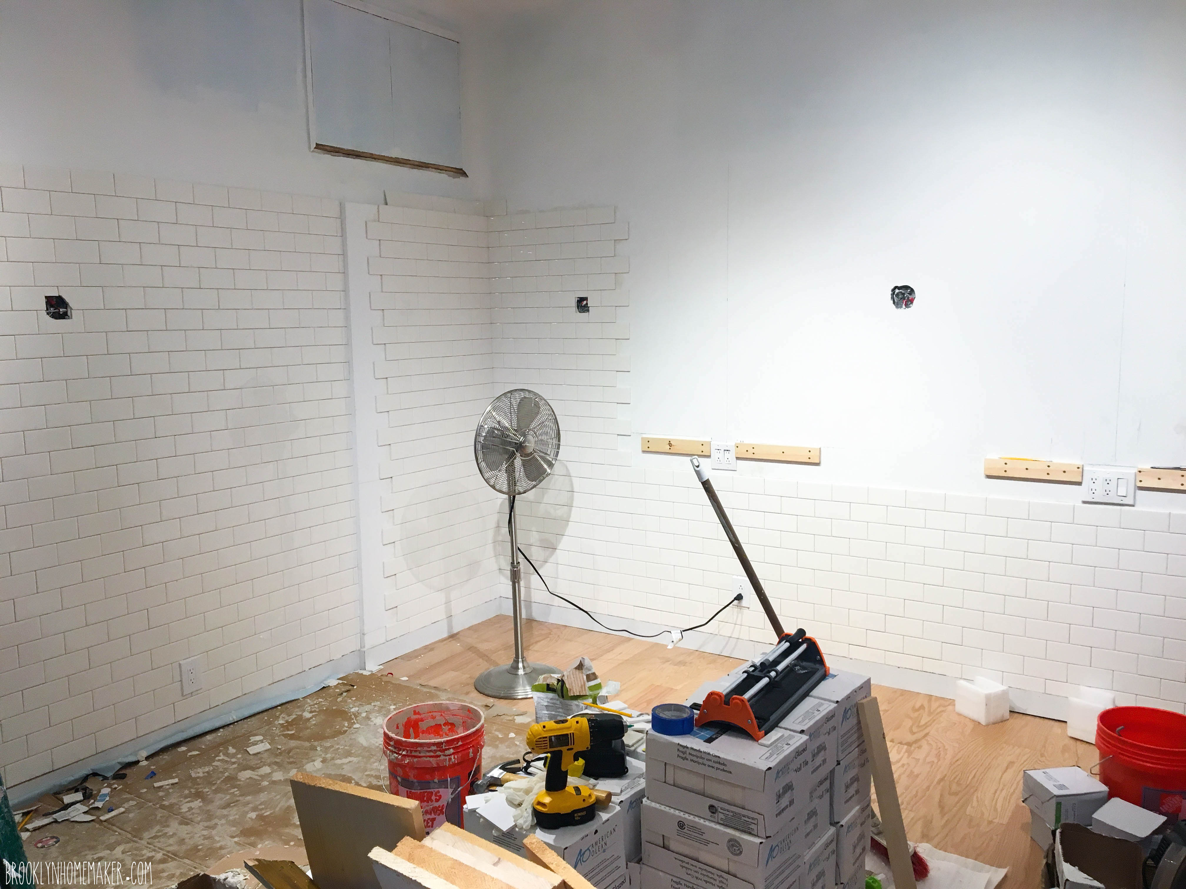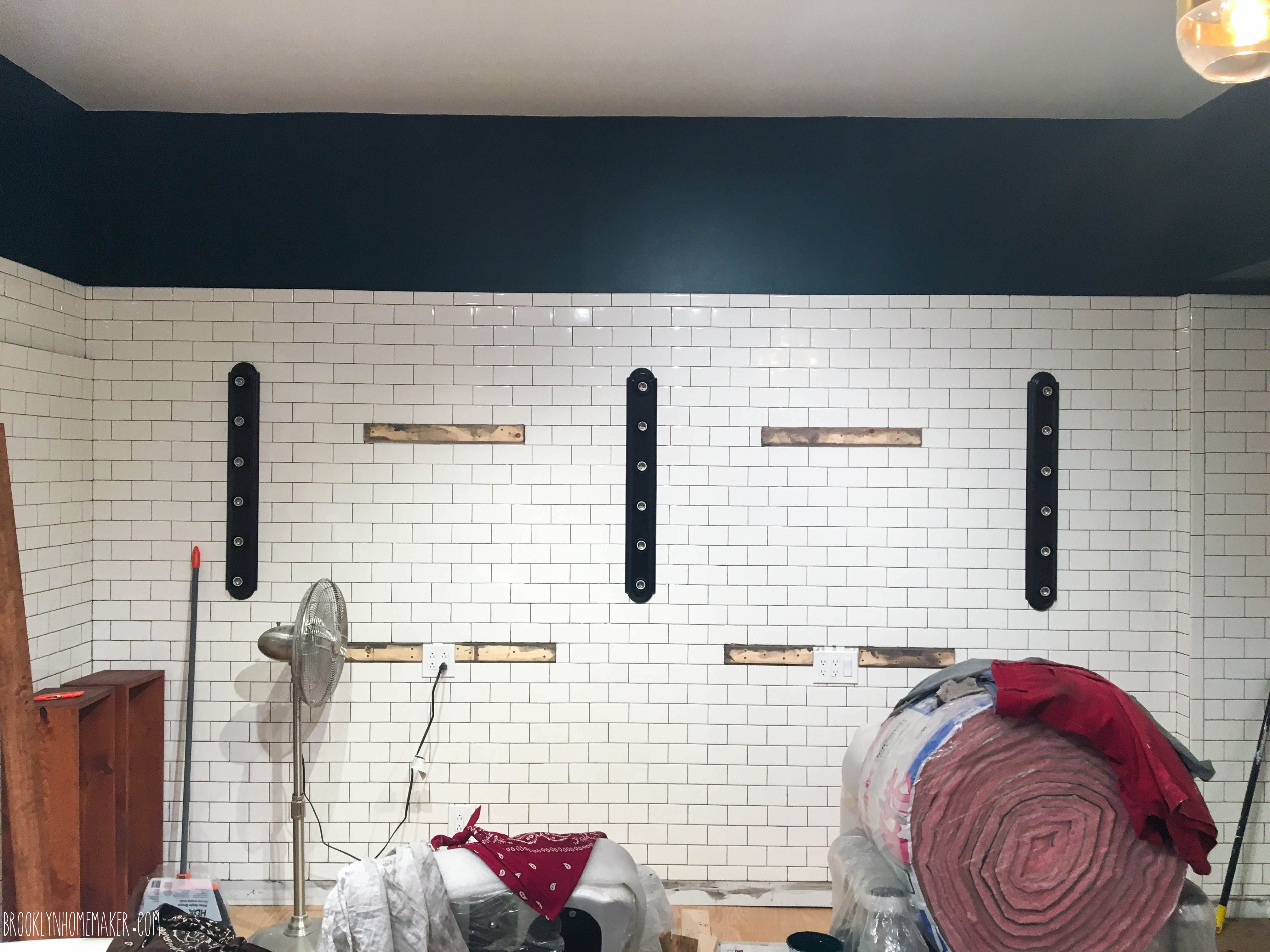 We knew from the very beginning that we wanted to cover most of the walls with simple white 3×6 subway tile. I know it’s sort of ubiquitous and “hipster-y”, especially here in Brooklyn, but there’s a reason it’s used so often and in so many applications. It’s attractive, timeless, compliments lots of different design styles, is relatively easy to install, and is even easier to keep clean. Also, most importantly to us, it’s freakin’ CHEAP! $0.22 a tile for American Olean subway tiles from Lowes meant that our whole shop was tiled from floor almost to ceiling on three walls for under $1,000 including the cost of mortar, grout, and all the tools.