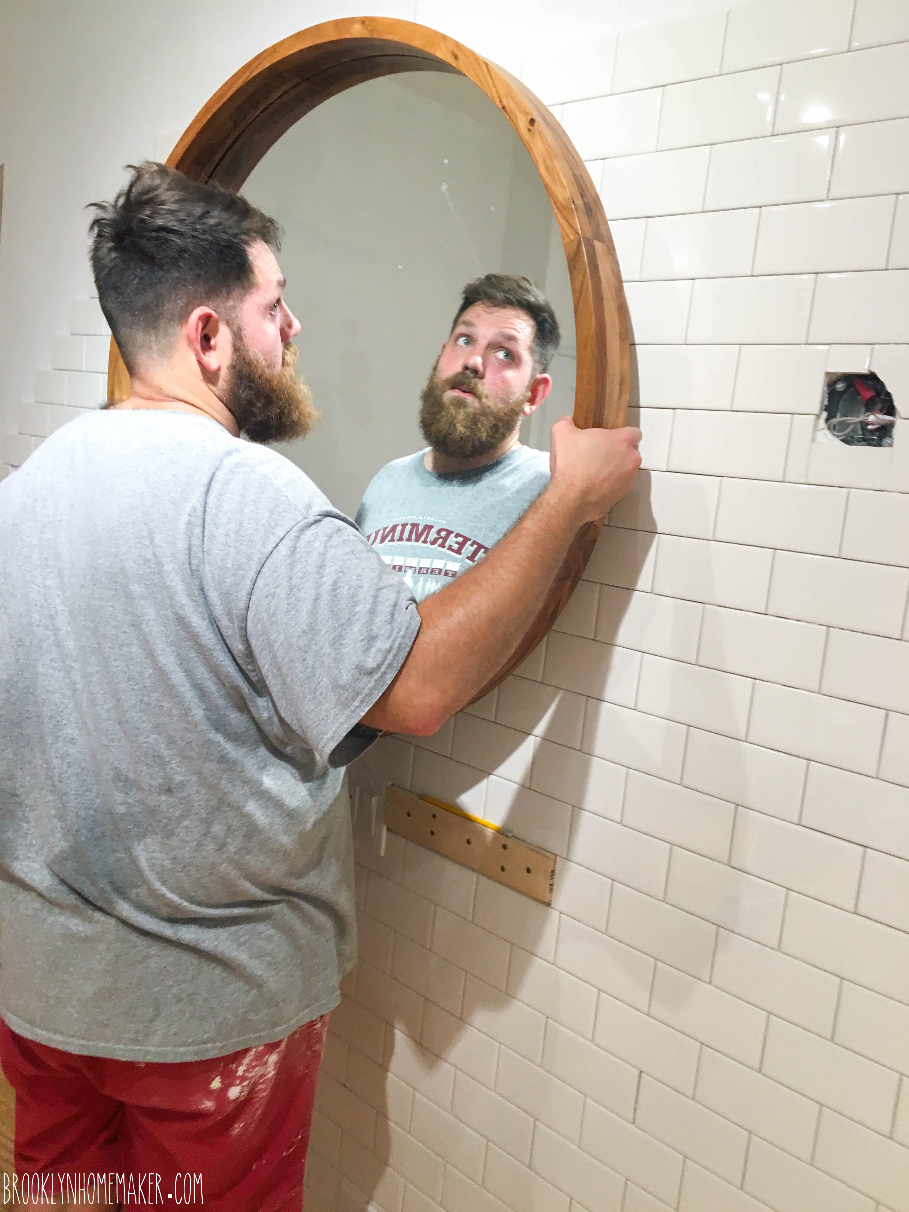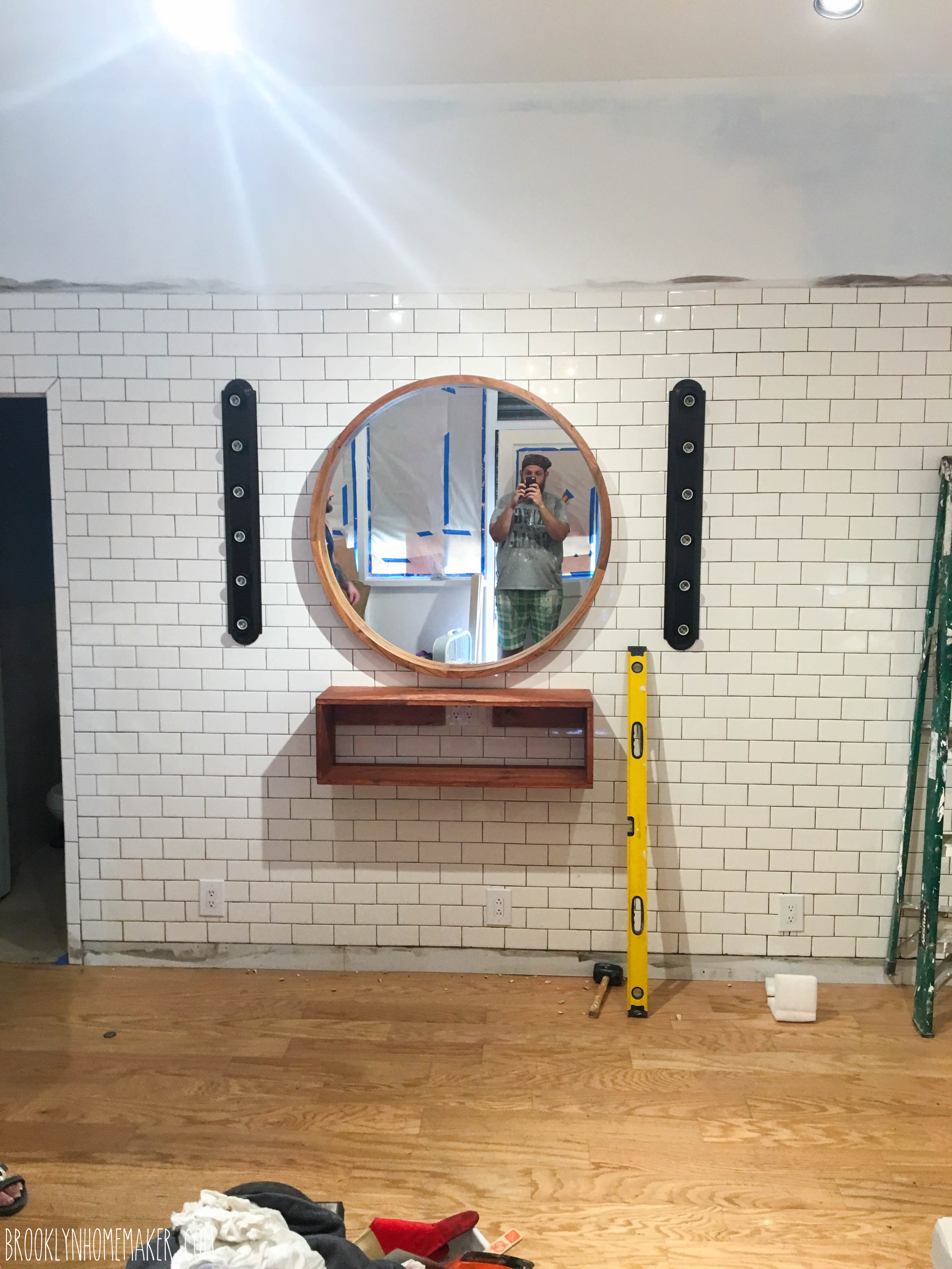 Before we got too far up the walls with the tile, we took some time to plan out where we wanted the shelves and mirrors for the stations to be hung, and mounted pine cleats (not sure if that’s the right word for what we did btw, so if you know, please share the knowledge!) attached to studs in the walls. That way we wouldn’t have to worry about trying find studs through a layer of ceramic tile, and then having to drill holes through the tiles we just put so much effort into putting up. It looked kind of weird and cheap and crappy while we were in the process, but once we were done and were able to actually attach the stations it all made sense and we were SOOO glad we did it.