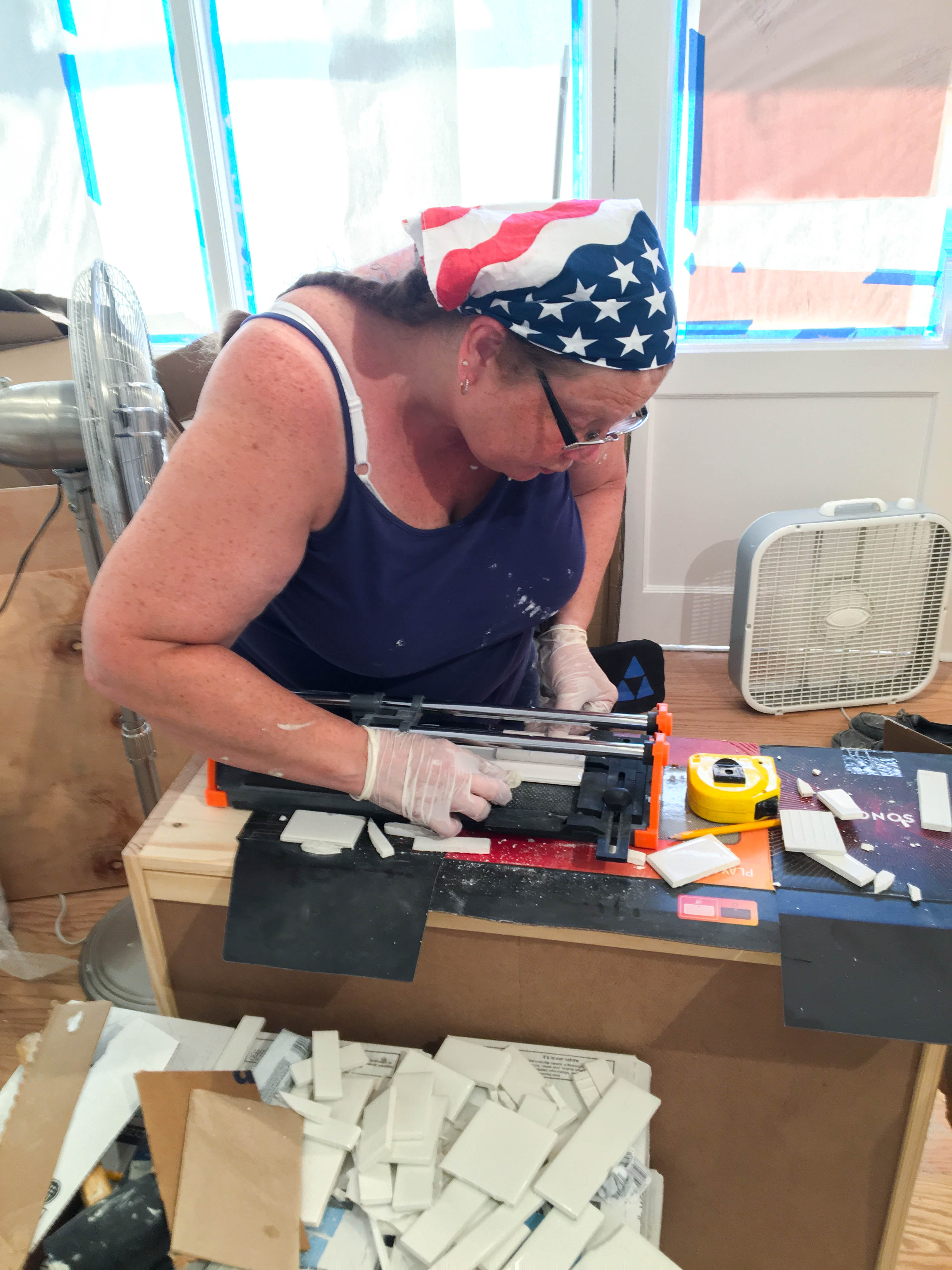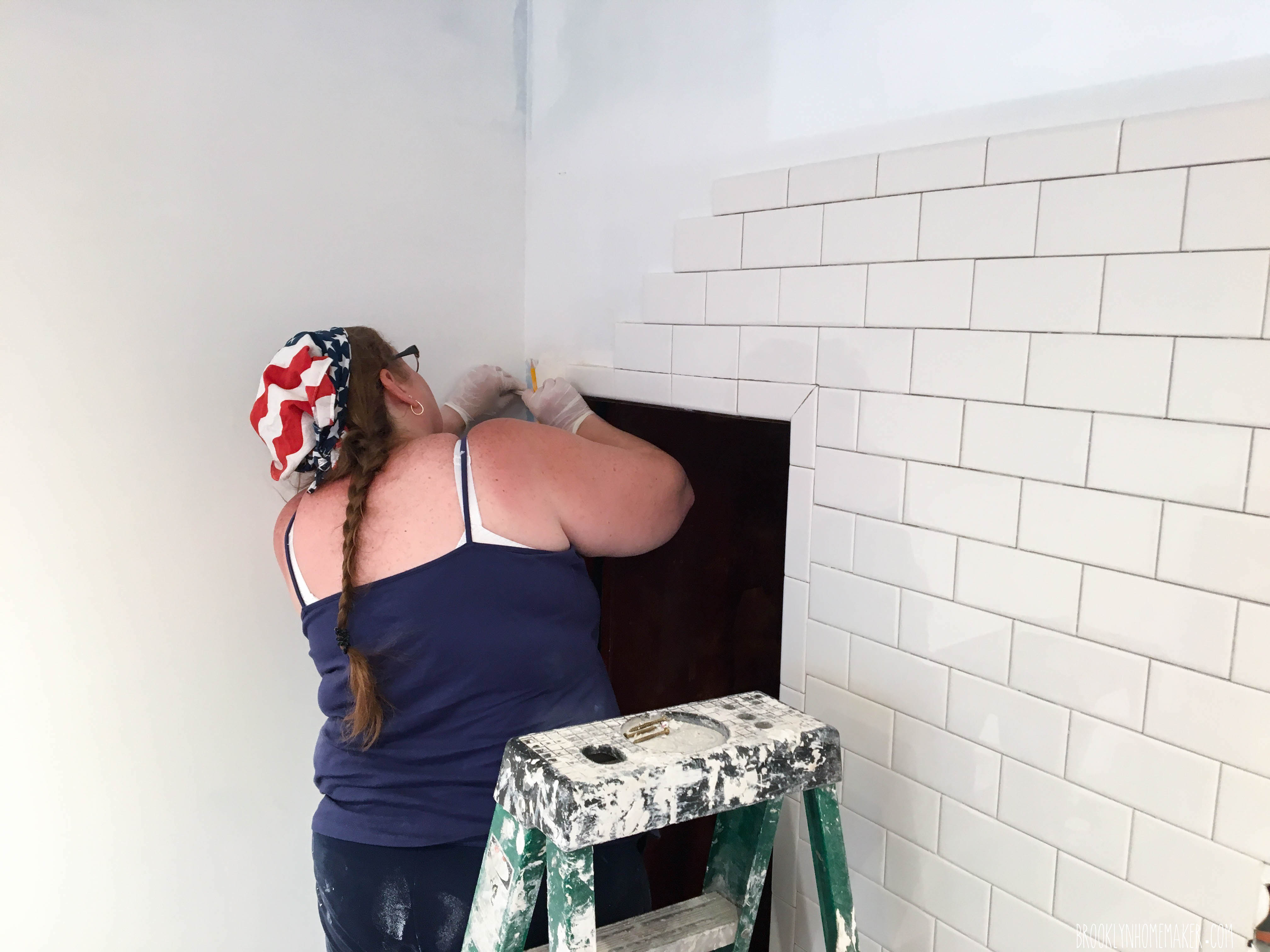 We started on one wall to get the hang of the process and slowly started creeping upwards and to the left. Once we got the first row level, the rest was actually surprisingly smooth sailing. By the time you get the hang of mixing and applying the mortar and arranging the tiles, things move along *relatively* quickly. That’s not to say there weren’t any frustrating moments or times I wanted to did throw a fit and/or cry, but for the most part the hardest thing was keeping our lines level, keeping straight rows on wonky 0ld walls, and measuring and cutting corner pieces. Mom and I worked out a pretty good system in the first few days though. She manned the tile cutter while I was in charge of mixing mortar and applying tiles. Of course we took turns and alternated duties sometimes, but we definitely figured out where our strengths and weaknesses lay, and thankfully they were mostly complementary.