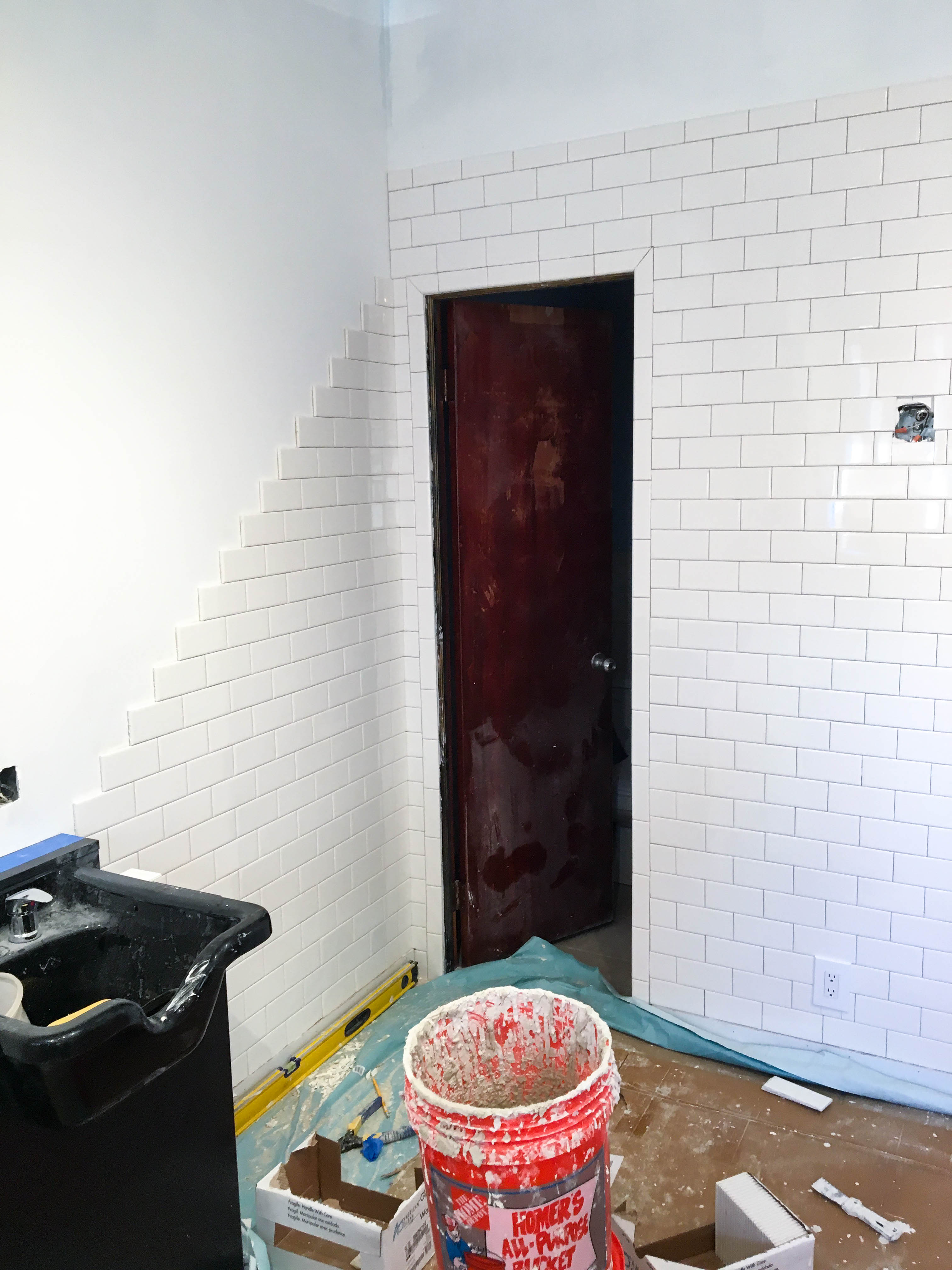 Neither of us had ever tiled before. I’ve always wanted to tile the backsplash in my kitchen, but every time I think about it I decide after weighing the options that it’s not worth the effort. In this case though, it was absolutely worth the effort if it meant having a gleaming showcase for Russell and his hair shop. And hey, I read Manhattan Nest. How hard could it really be?