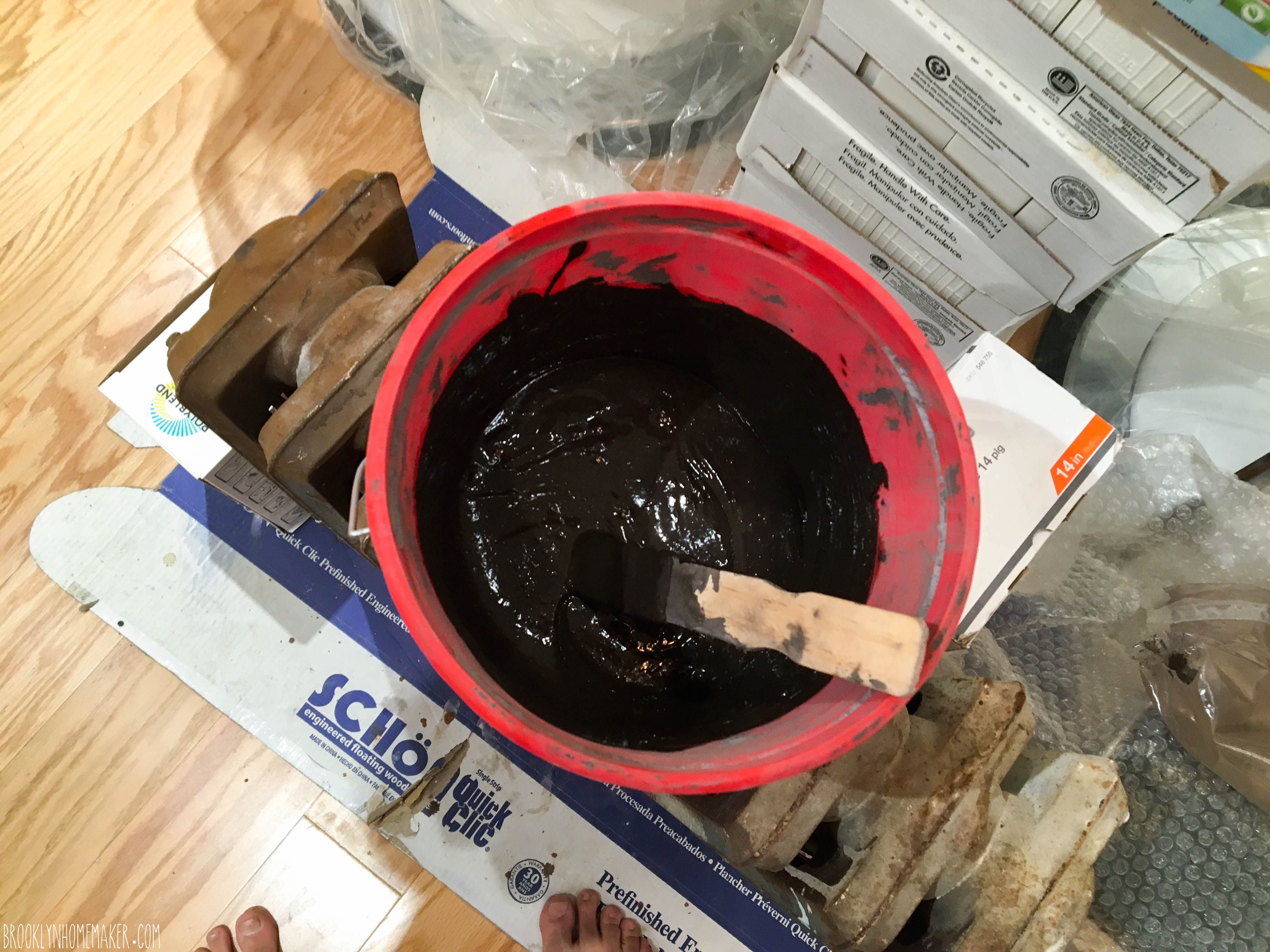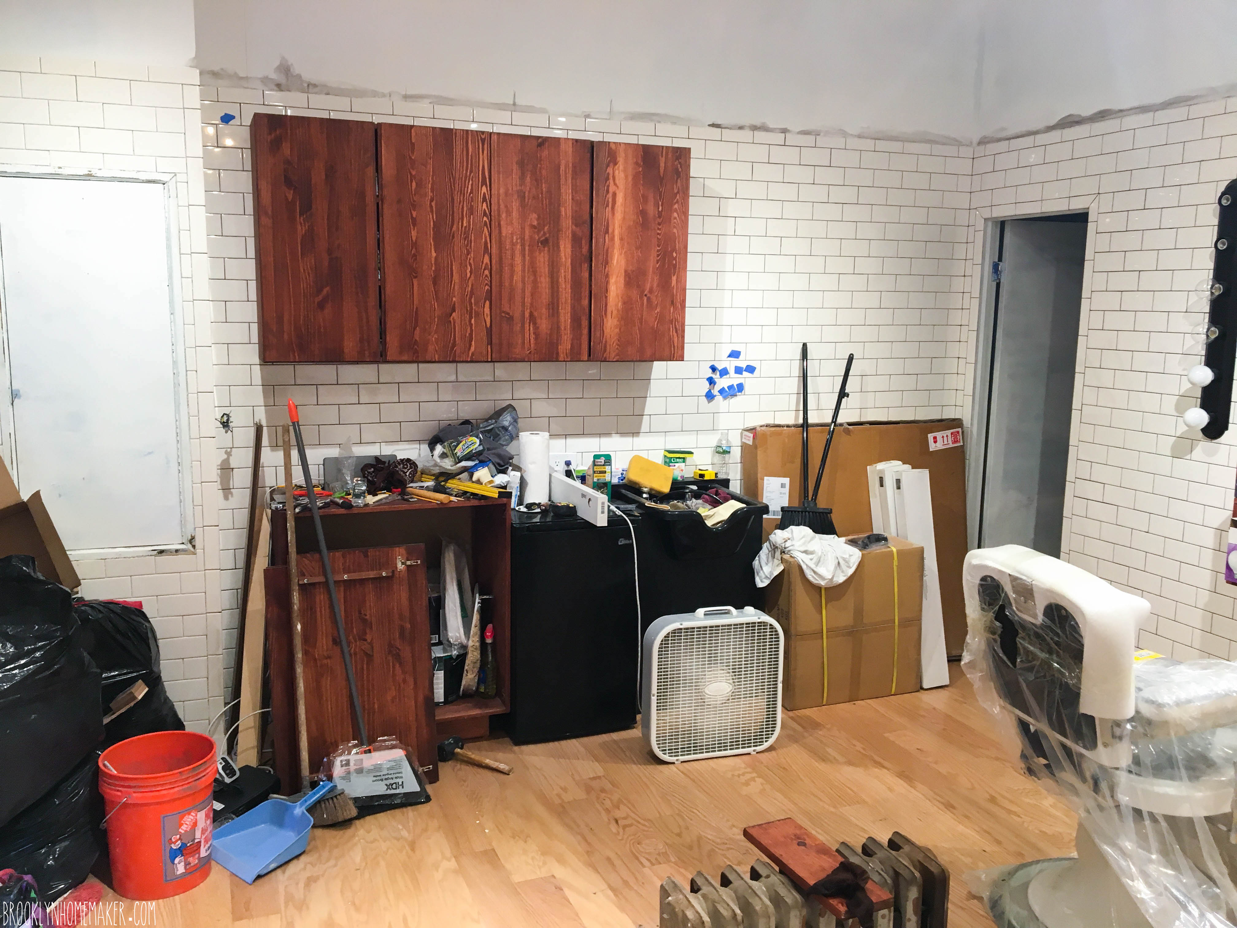 Of course, that was all easier said than done. Russell had to leave for a trip to London that he’d planned and paid for well before the shop was even a glimmer in our eyes, and the flooring order took longer than expected and wasn’t ready until after he left.  Since we don’t have a vehicle, I decided to take the subway to a neighborhood in Queens I’ve never been to before, google maps my way to the warehouse, and once the order was ready and brought out to me, call a taxi service to pick me up and carry me and my 11 cases of wood flooring back to Bushwick. You can’t imagine the looks I got from the warehouse guys when they asked if I wanted help putting my order in my truck and I had to explain that I was calling a car service! It also just happened to be a crazy hot day, and I was so embarrassed that I waited outside in the sun the whole time. Then, of course the driver got stuck in traffic on his way to me, and I sat there sweating my ass off for over 30 minutes!