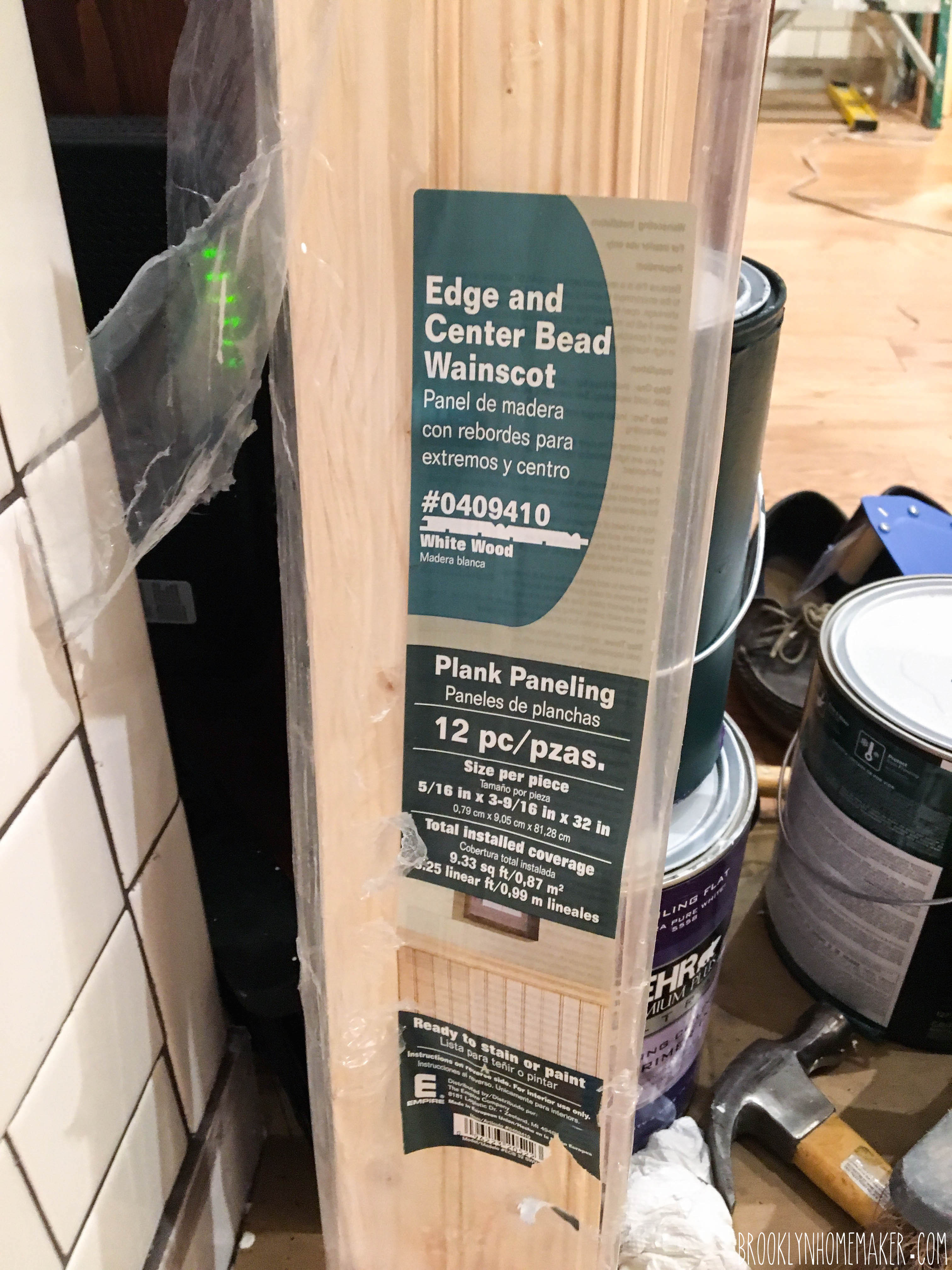 I played with a ton of different options in my head, but none of them ever turned out to be plausible. Once the tiling was done and we had no choice but just figure it out, we took a trip to hardware store to see what we could come up with. We were just about at our wit’s end after spending waaaay too much time wandering the aisles and coming up with zilch, when suddenly I spotted these packs of tongue and groove wainscoting panels. They were just about the right height and could easily be fit to the width we needed. Score!