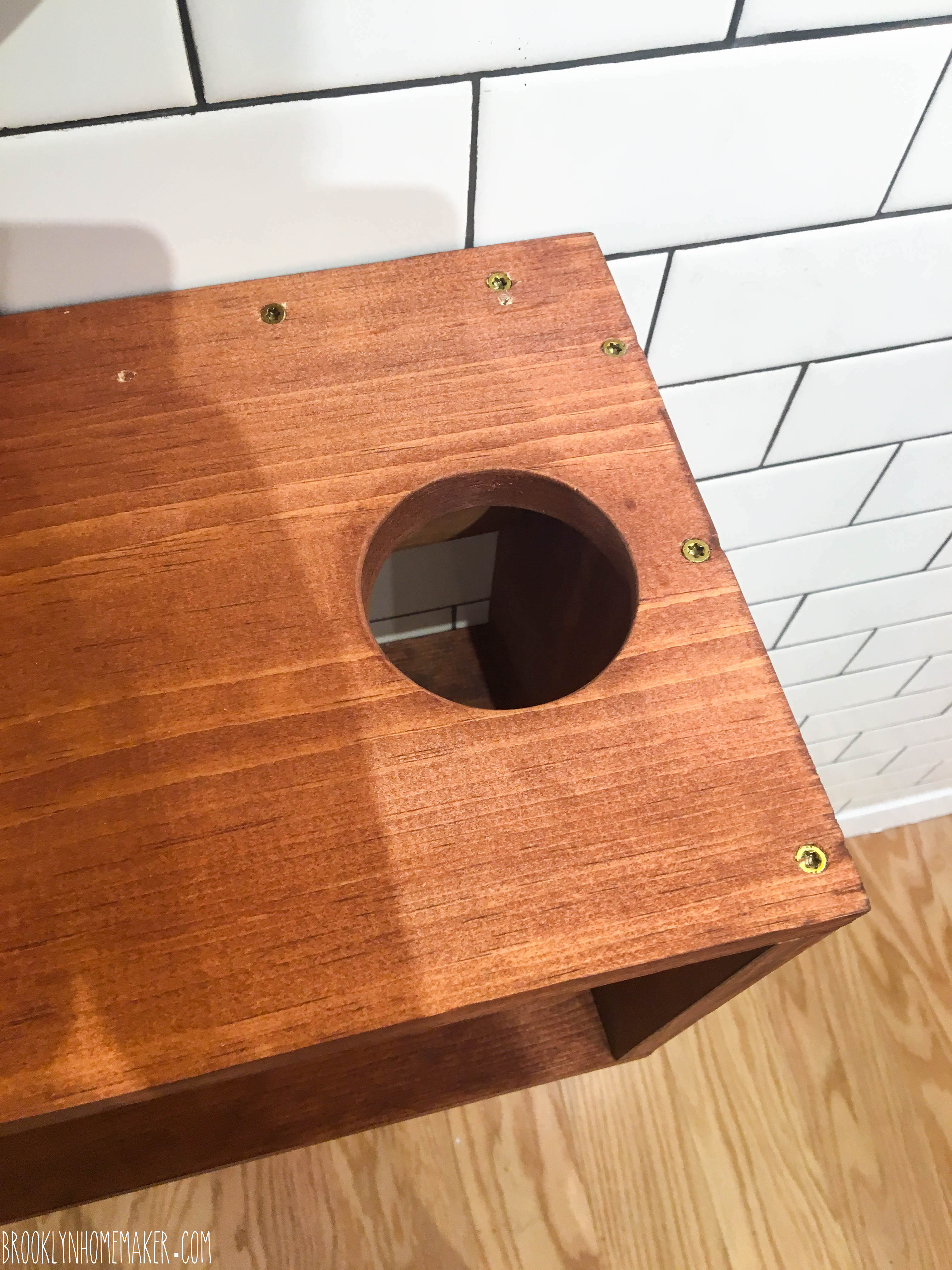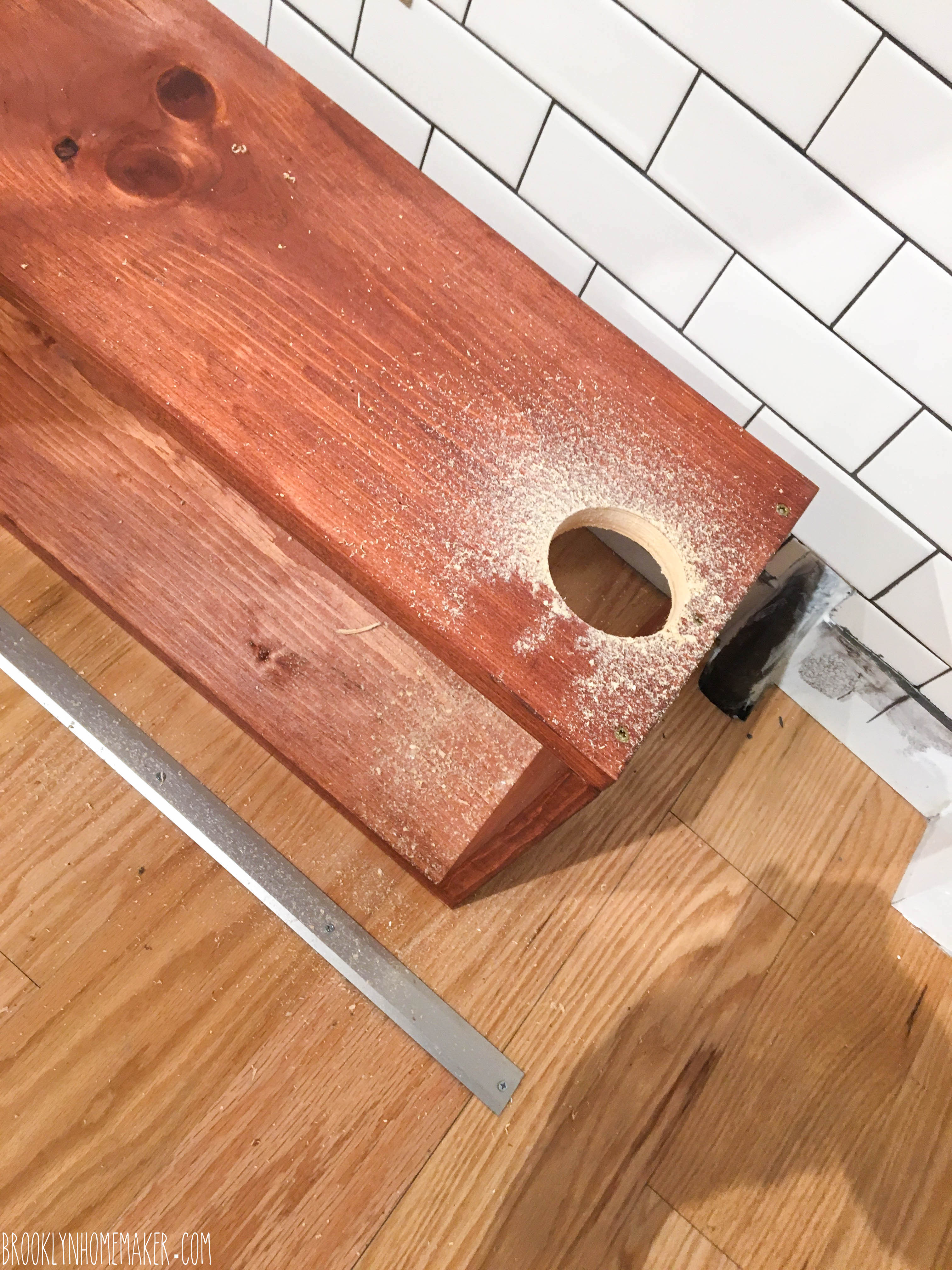 We didn’t have a table saw so we weren’t able to cut our own panels of wood to size, our contractor was already finished and long gone, and all the hardware stores we spoke to refused to cut the panels to the exact size we needed. The Home Depot in Brooklyn even has a big sign at the wood cutting station that says “No precision cuts”, which we assumed meant they couldn’t guarantee cuts to an exact 1/16th of an inch measurement, but what it really meant was that all they’re really willing to do is cut a board in half for you so it’ll fit in your car.