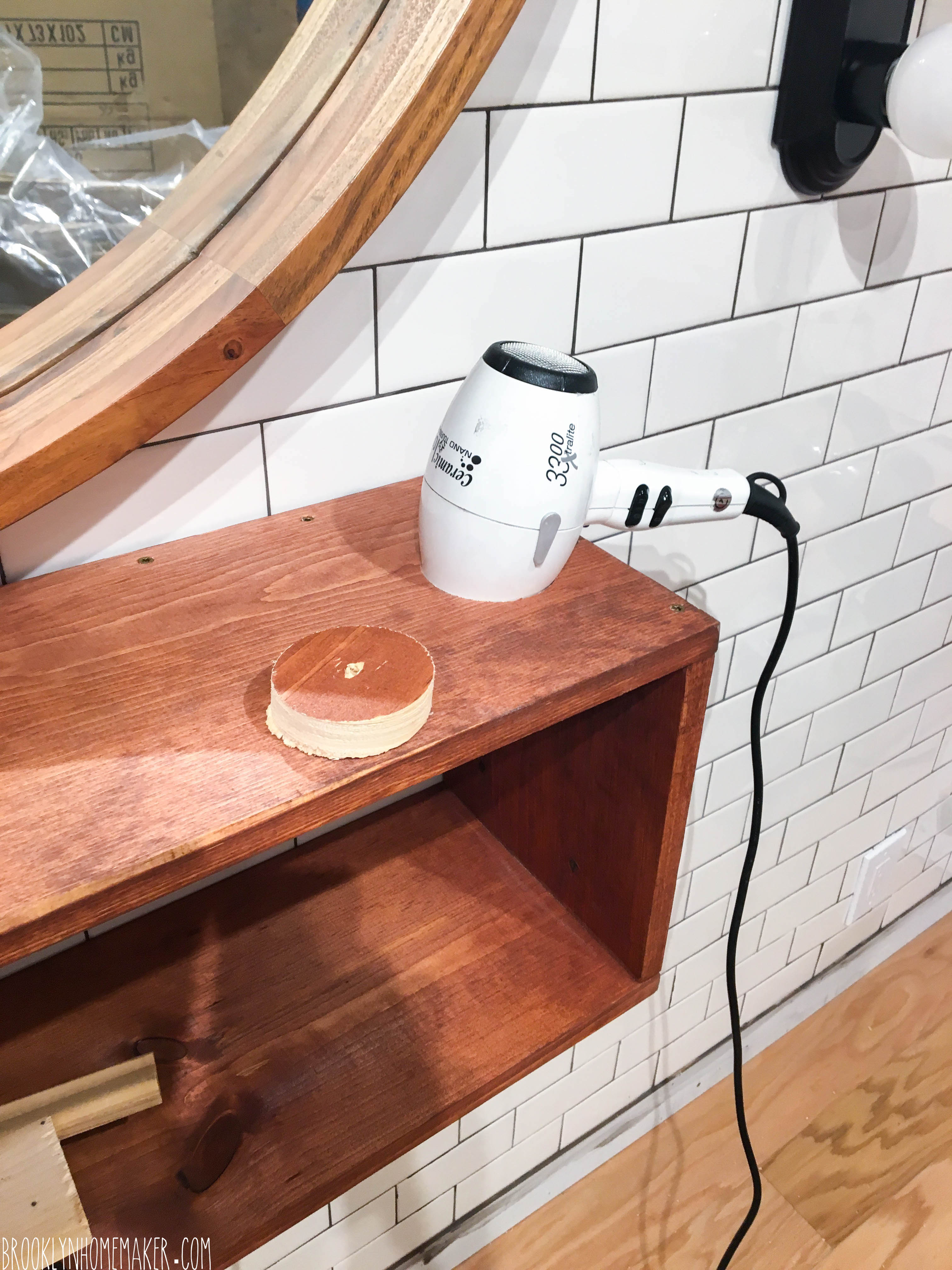 Russell requested that we find a way to add a hole in the stations to hold a hair dryer, and thankfully, there’s a drill bit for that! Easy Peasy!