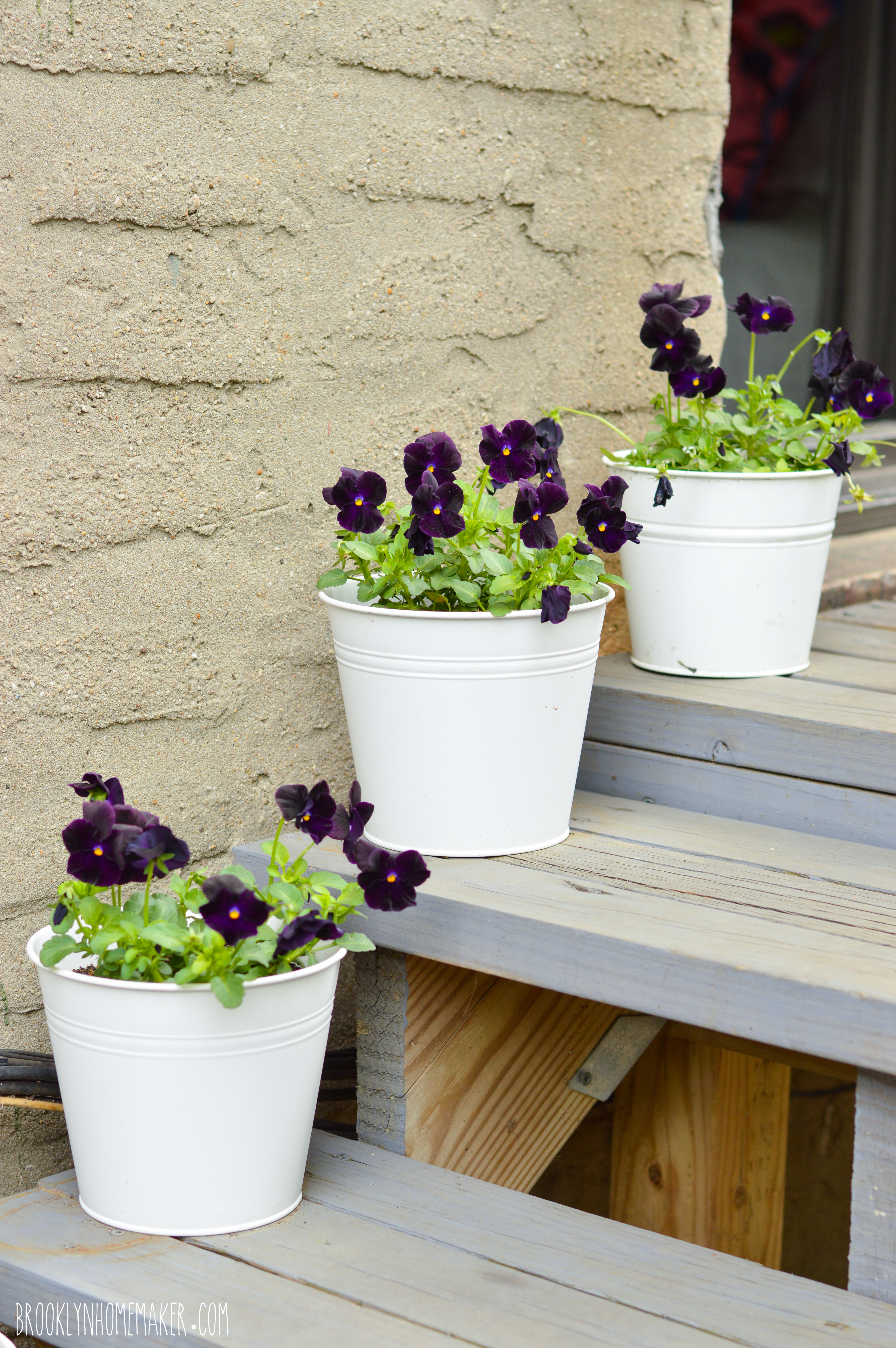 Early in the spring I usually try some pansies too for some color and life while the hostas are just barely poking out of the ground, but they don’t really last once the weather turns hot and I’ll need to replace them with something else mid-summer. They looked great in the photo below, but they’re already starting to look pretty scraggly.