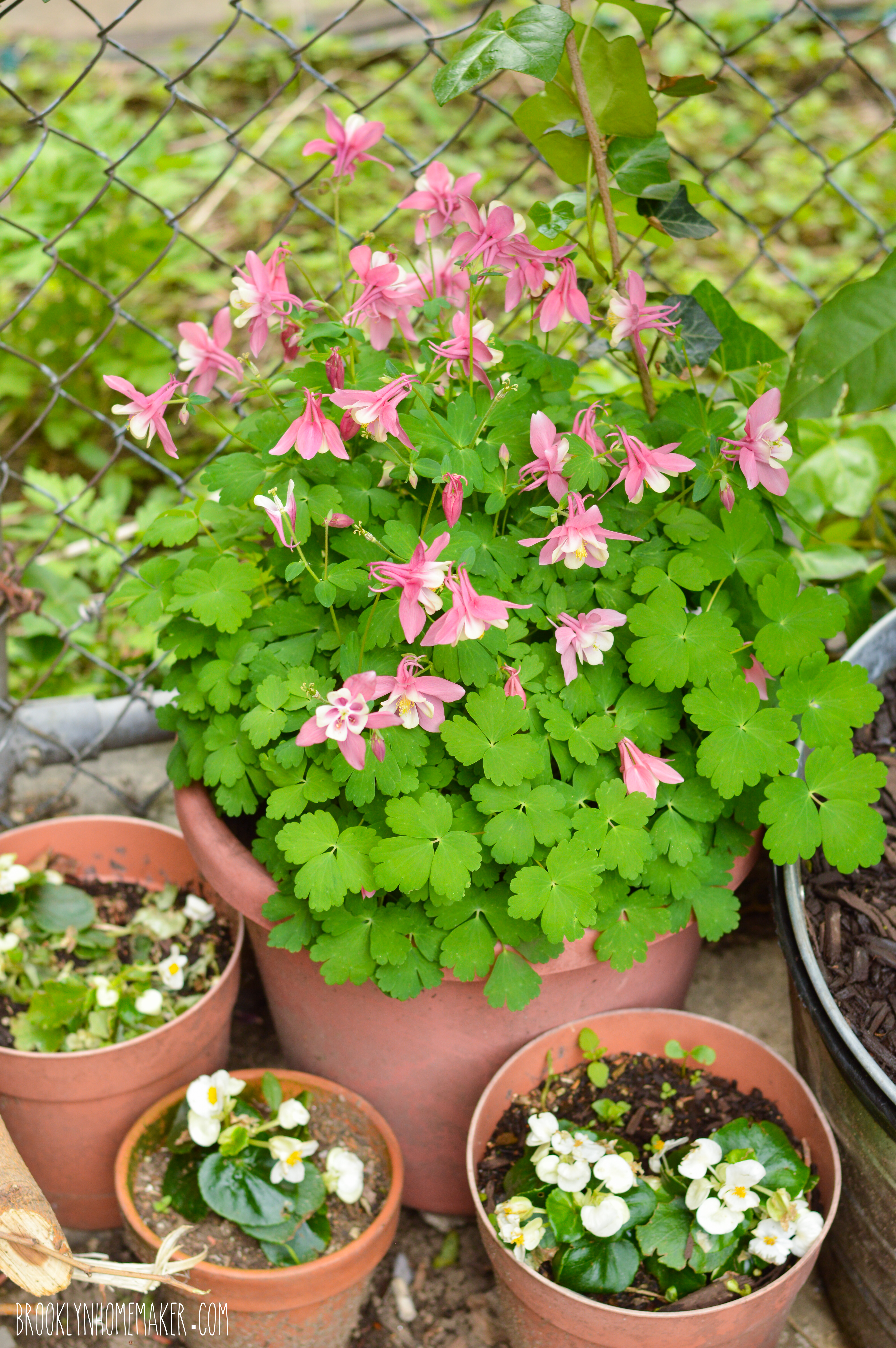 To mix in some color and texture, I like to fill pots with hardy annuals like wax begonias and I always do a few herbs in one of the big galvanized buckets we added a few years ago too. Sometimes they don’t get enough sun and don’t last the whole summer, but they’re nice while they last and so far they seem to be doing well this year.