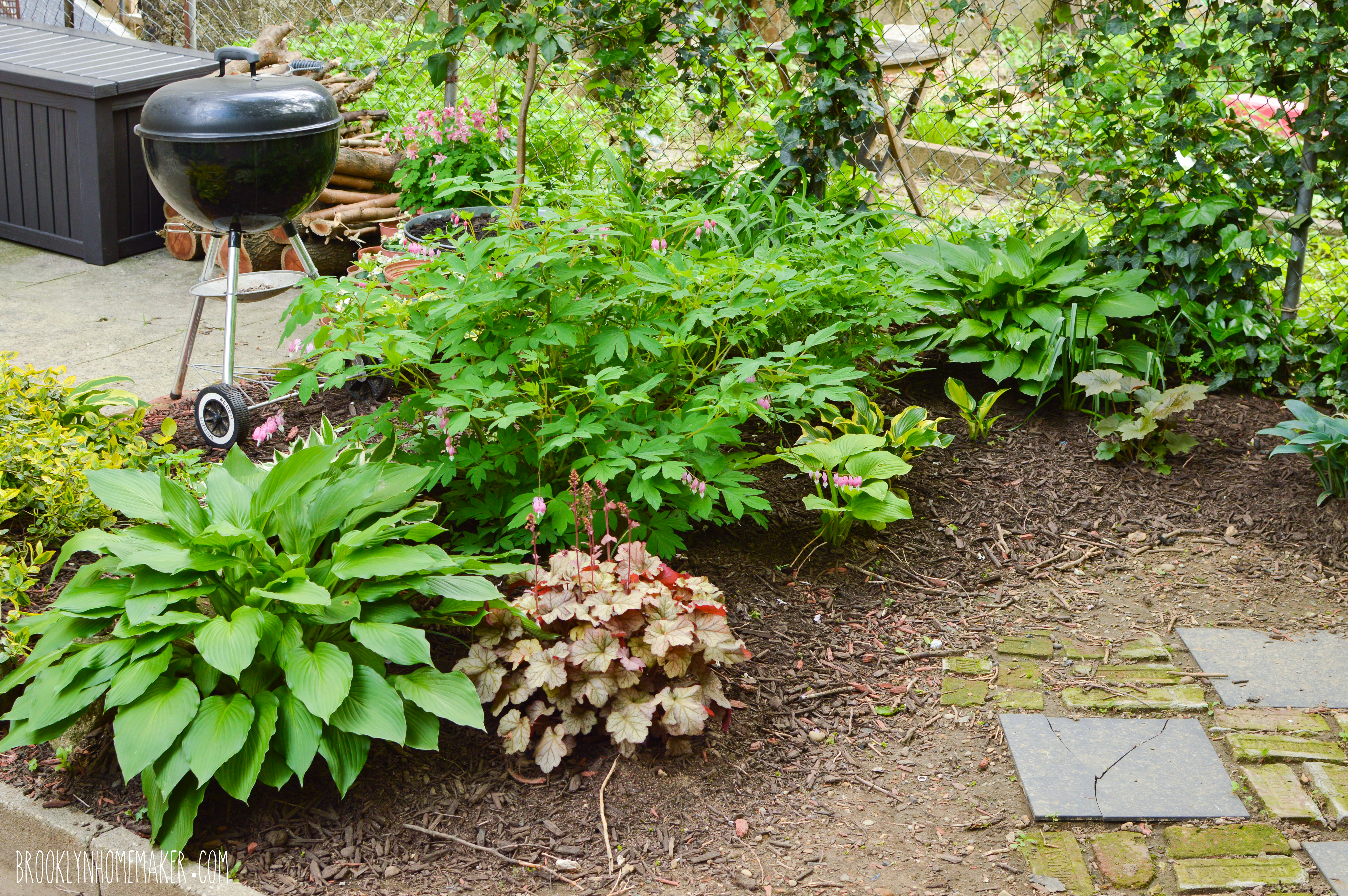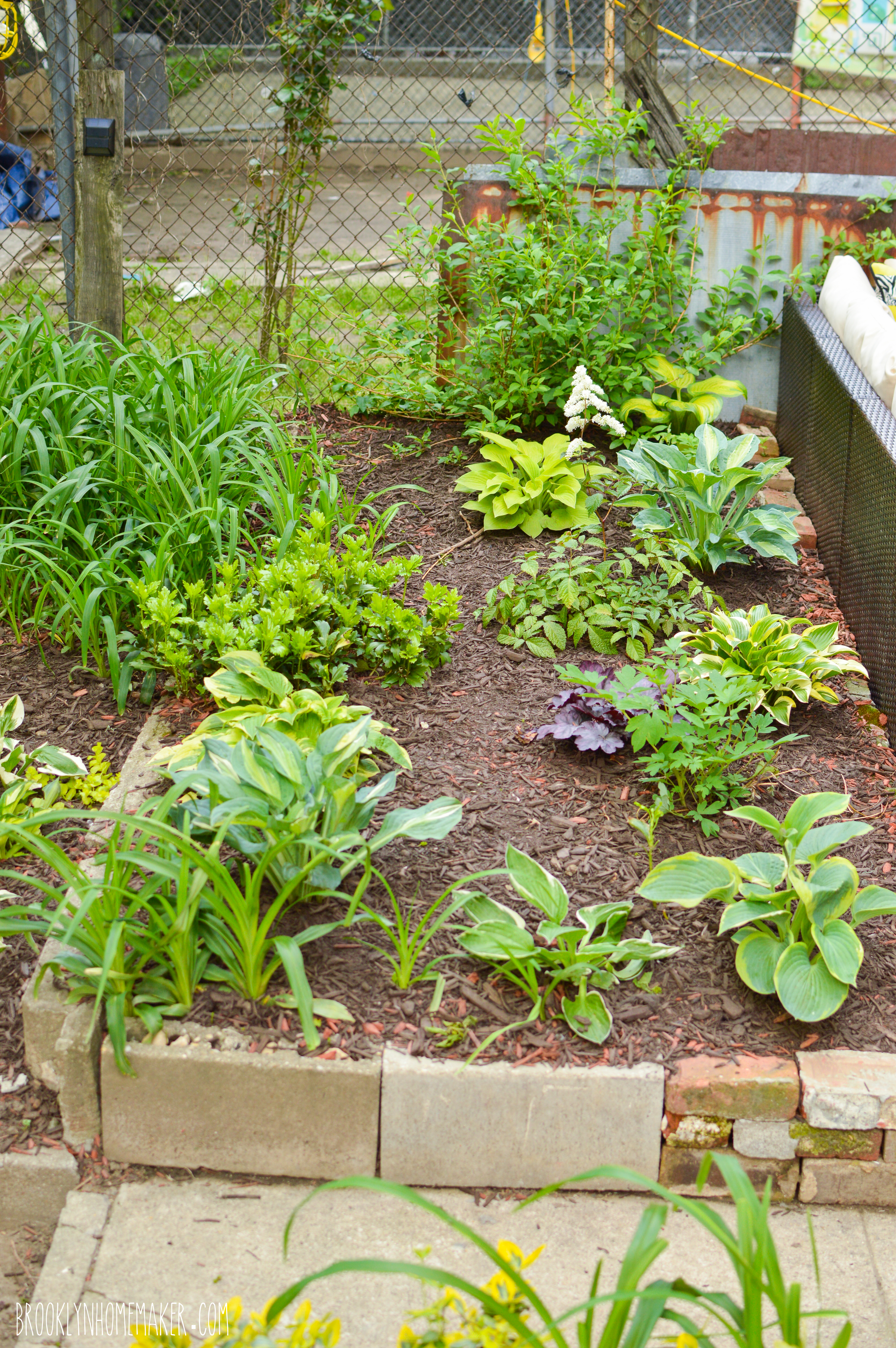 For the first time ever this year, I mulched a good portion of the beds to try to keep them moist and healthy during the hot dry spells we always seem to get in Brooklyn summers. Not only do I hope it’ll keep the plants happier, it also went a long way in making the yard feel so much more “finished” and attractive. We went with brown mulch so it doesn’t really “read” in photos all that well, but I promise it looks great in person, especially compared to bare dirt. Getting the heavy, wet, stinky bags of mulch out there meant carrying them all by hand through our apartment and out our bedroom window, and we needed about 30 bags for the area we mulched, but it was well worth the effort in the end and I really wish we’d done it sooner!