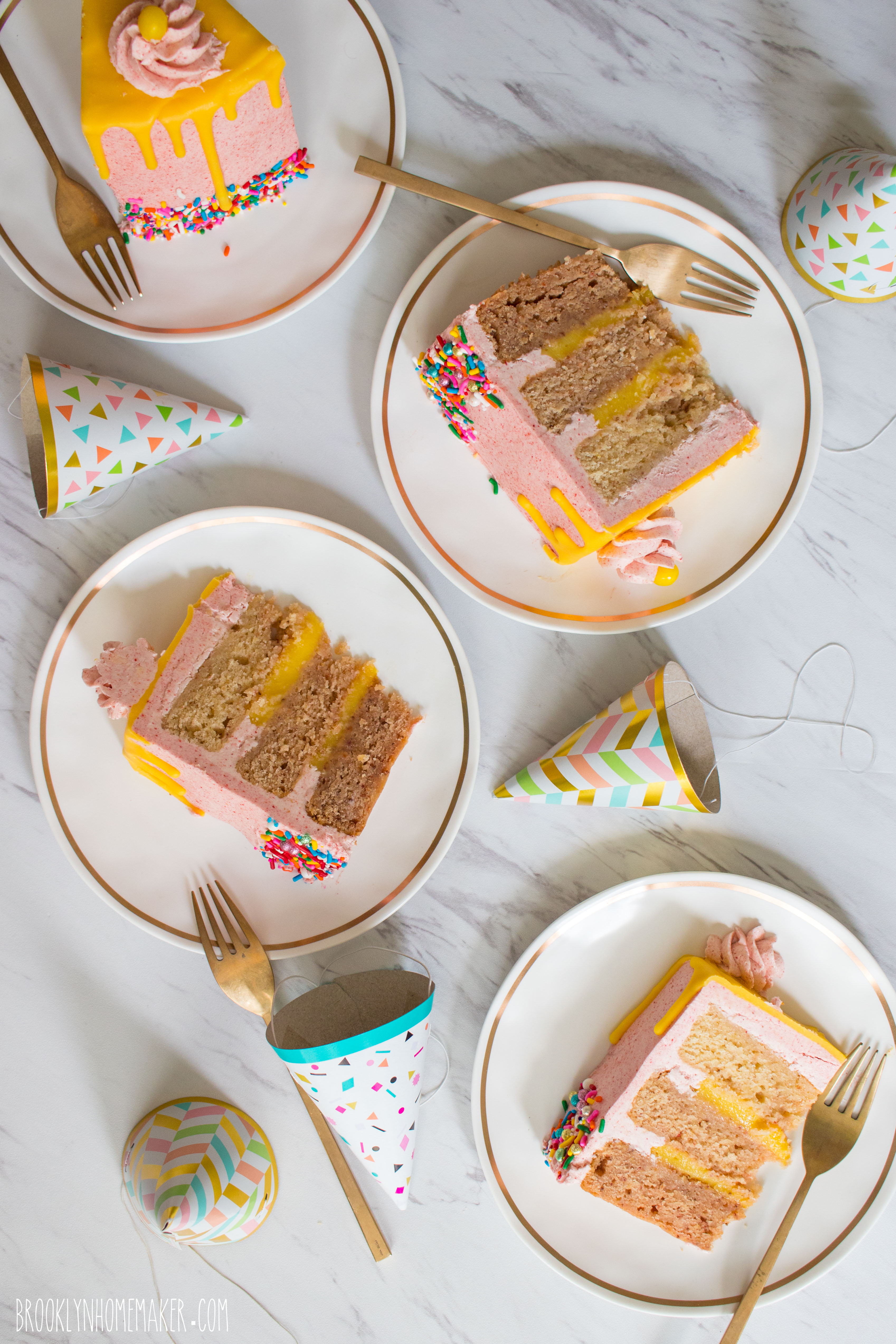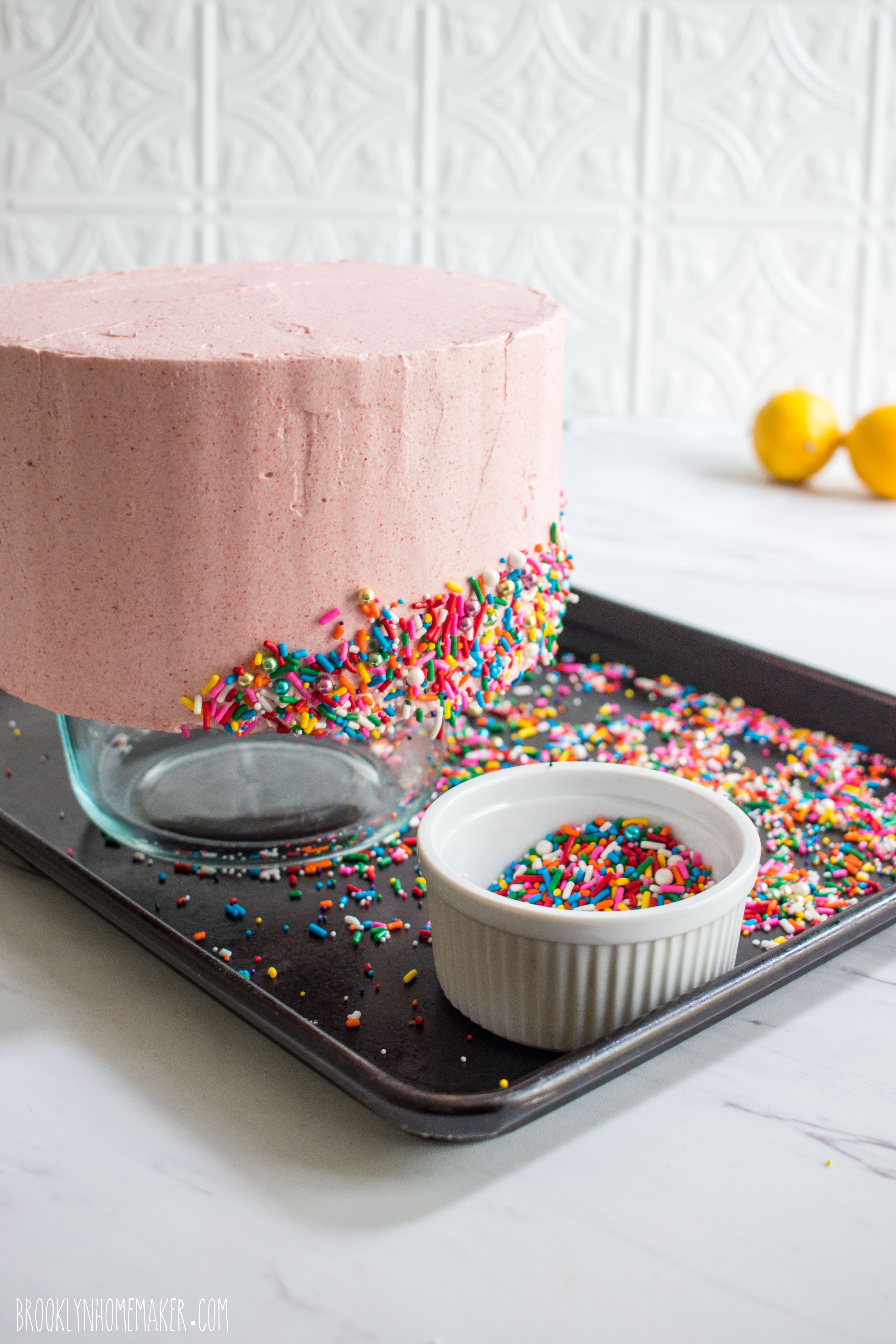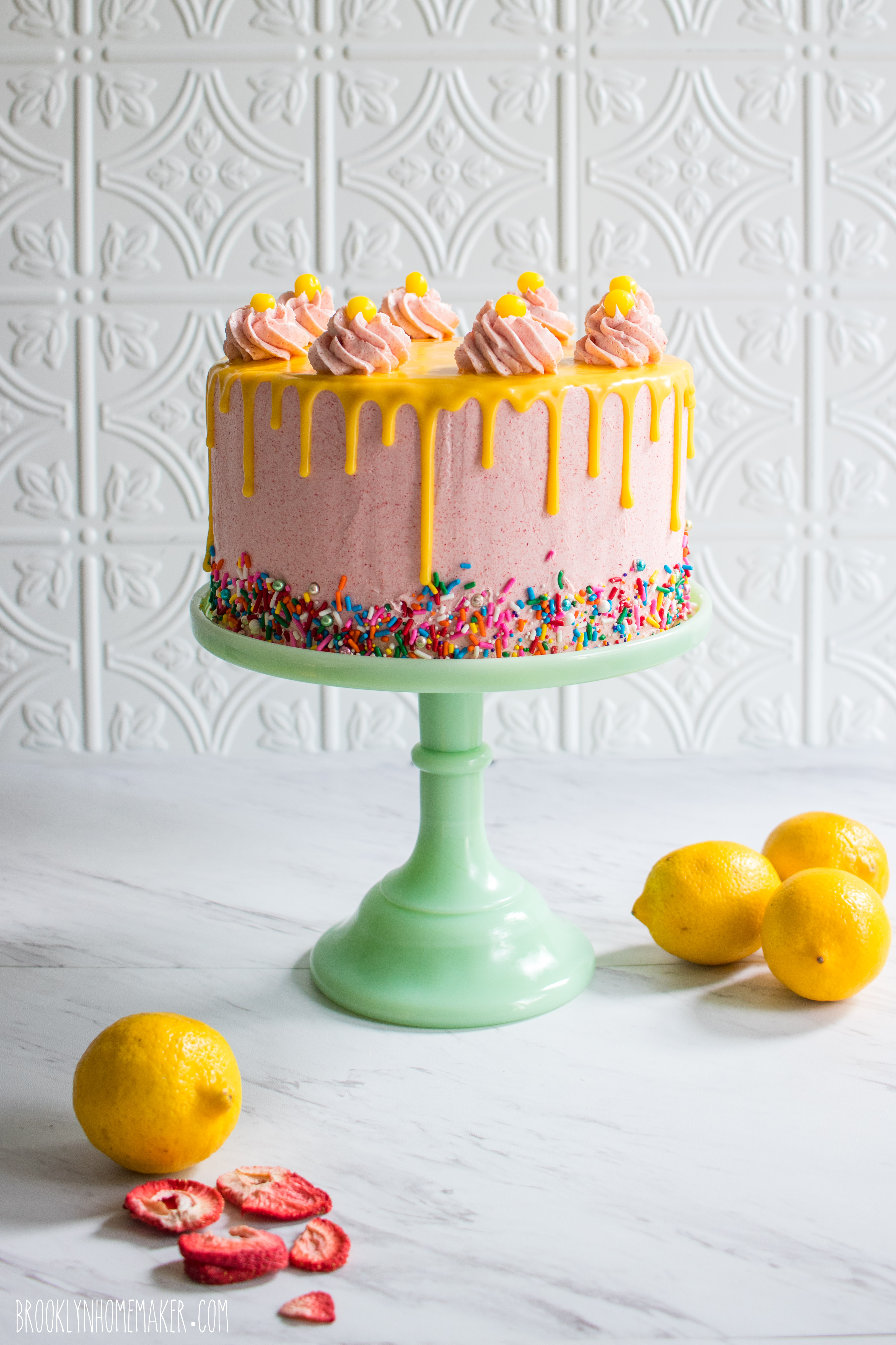 Since I’m telling you the whole story here, you’ve probably guessed by now that I also made a fancy pants birthday cake for her too. She loves all things lemon, so my first instinct was to go all out lemon on lemon on lemon. Then one night I was inspired and decided to throw some strawberries in the mix too, cuz why not? Since the party was going to be totally over the top, I figured the cake should be too, right?
