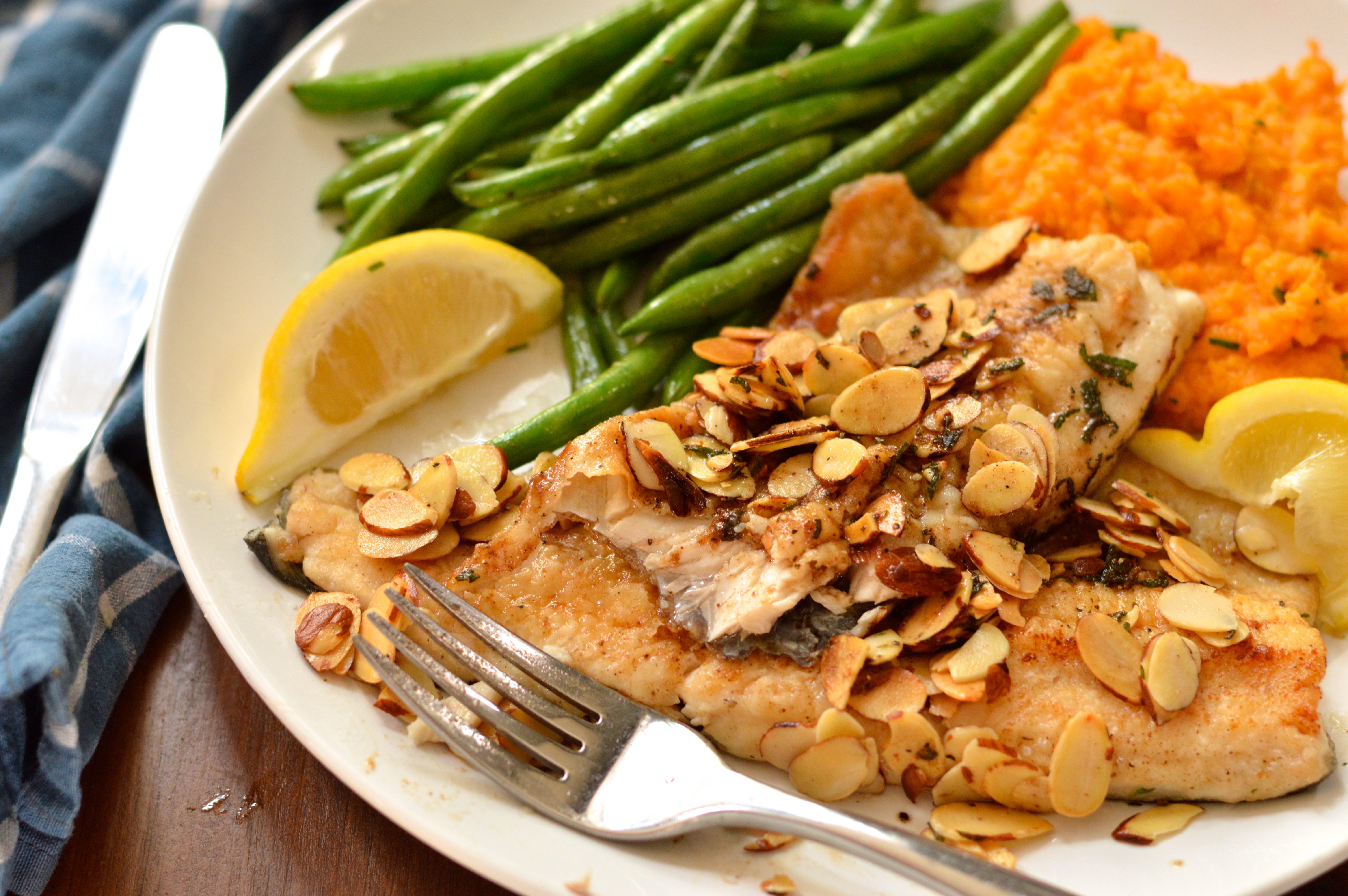 Add the remaining 3 tablespoons of butter and cook over high heat until it stops bubbling and turns a nutty brown. Add the sliced almonds and stir until just barely toasted. Remove the pan from the heat and allow to cool for a few seconds. Toss in the parsley and a little salt and pepper and stir to combine. Pour everything over the trout fillets and squeeze with a bit of fresh lemon juice. Serve immediately, with lemon wedges, mashed sweet potatoes, and sautéed green beans if desired