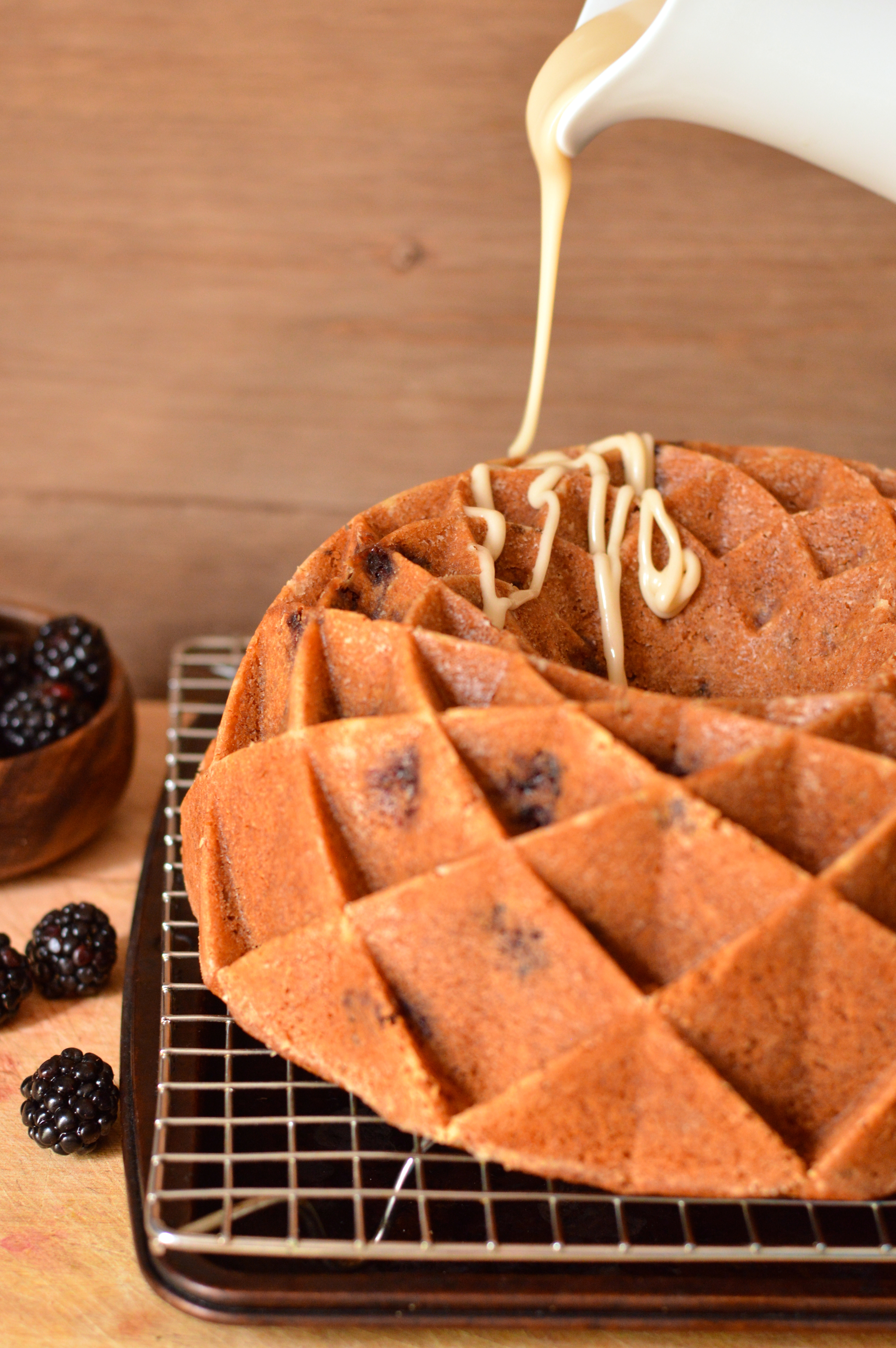 Spoon batter into prepared bundt pan and smooth the top. WARNING: At this point the batter will look and taste like butter pecan ice cream, but if you eat it all, you won’t have any left for your cake. Bake at 350 for 50 to 55 minutes, or until a toothpick or cake tester inserted into the middle of the cake comes out clean. Let cool on a wire rack for about 20 minutes before inverting the pan to release the cake onto the rack. Let cool completely before adding drizzle.