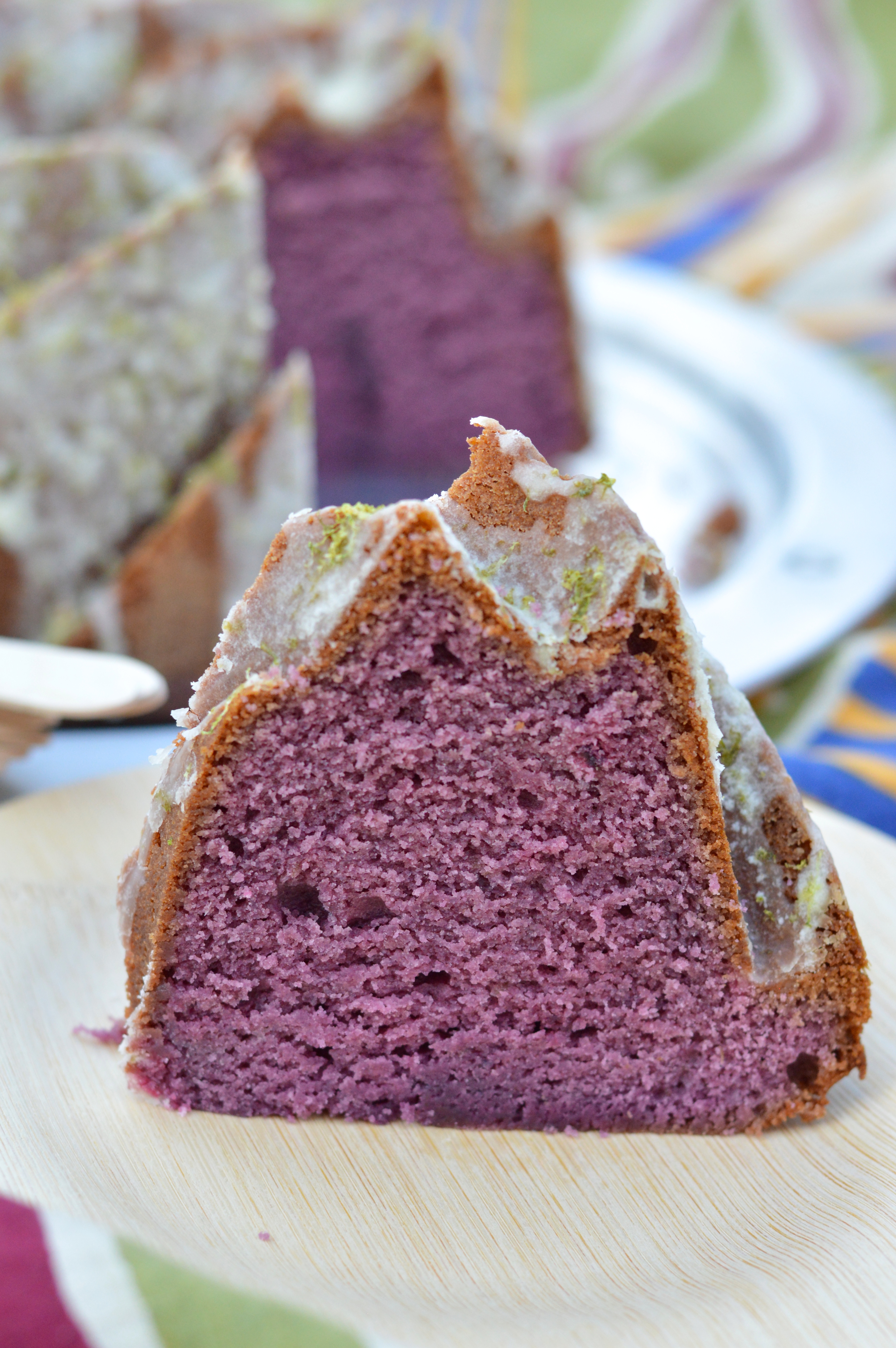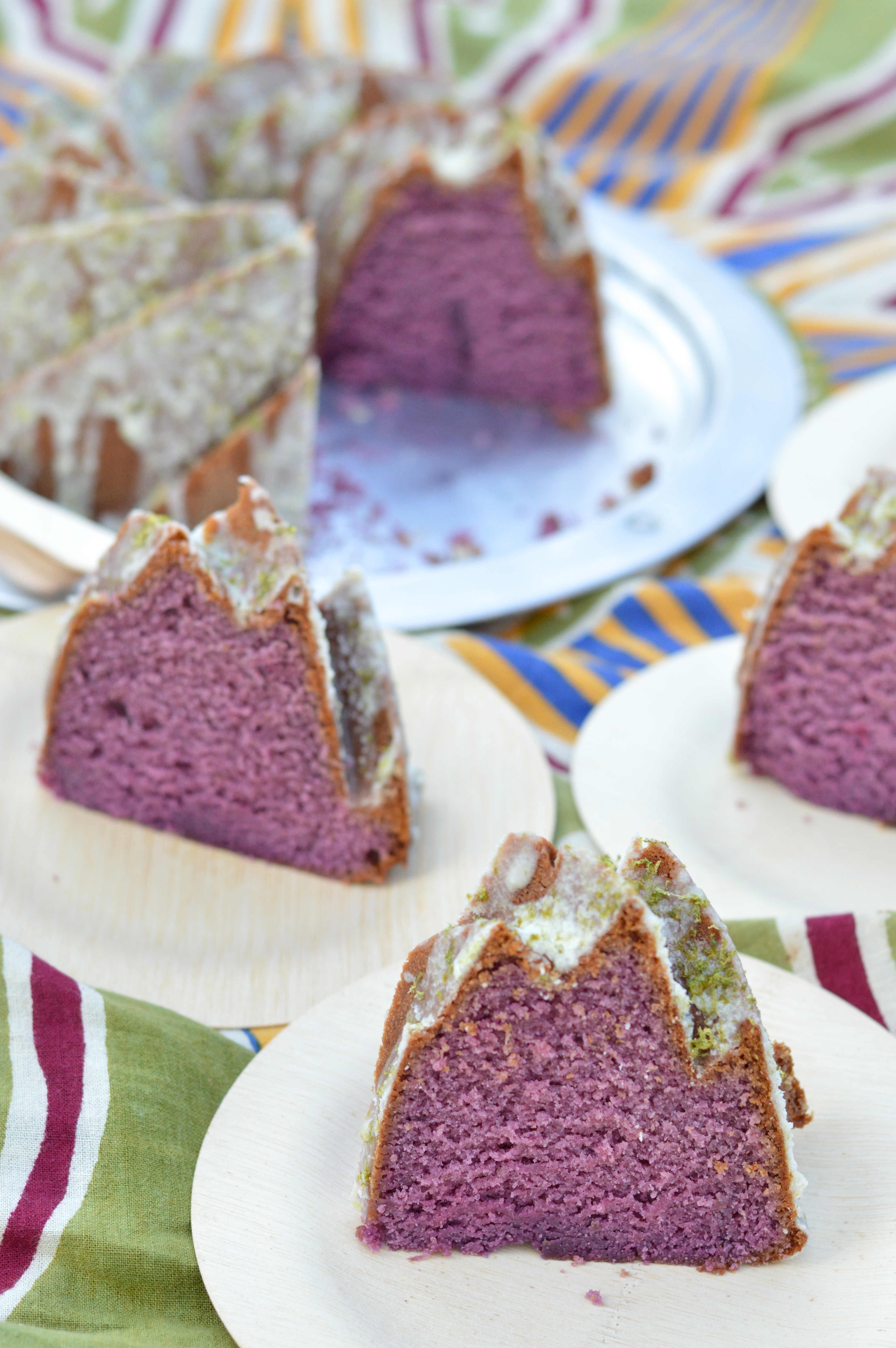 When baked, the interior retained that purple color but the outside of the cake faded and browned. At first I was disappointed but then I realized it would make for an even more dramatic presentation when sliced. Just imagine bringing this unassuming, seemingly normal looking bundt cake to a party and slicing in to reveal the beautiful brilliant purple interior. Talk about wow factor!