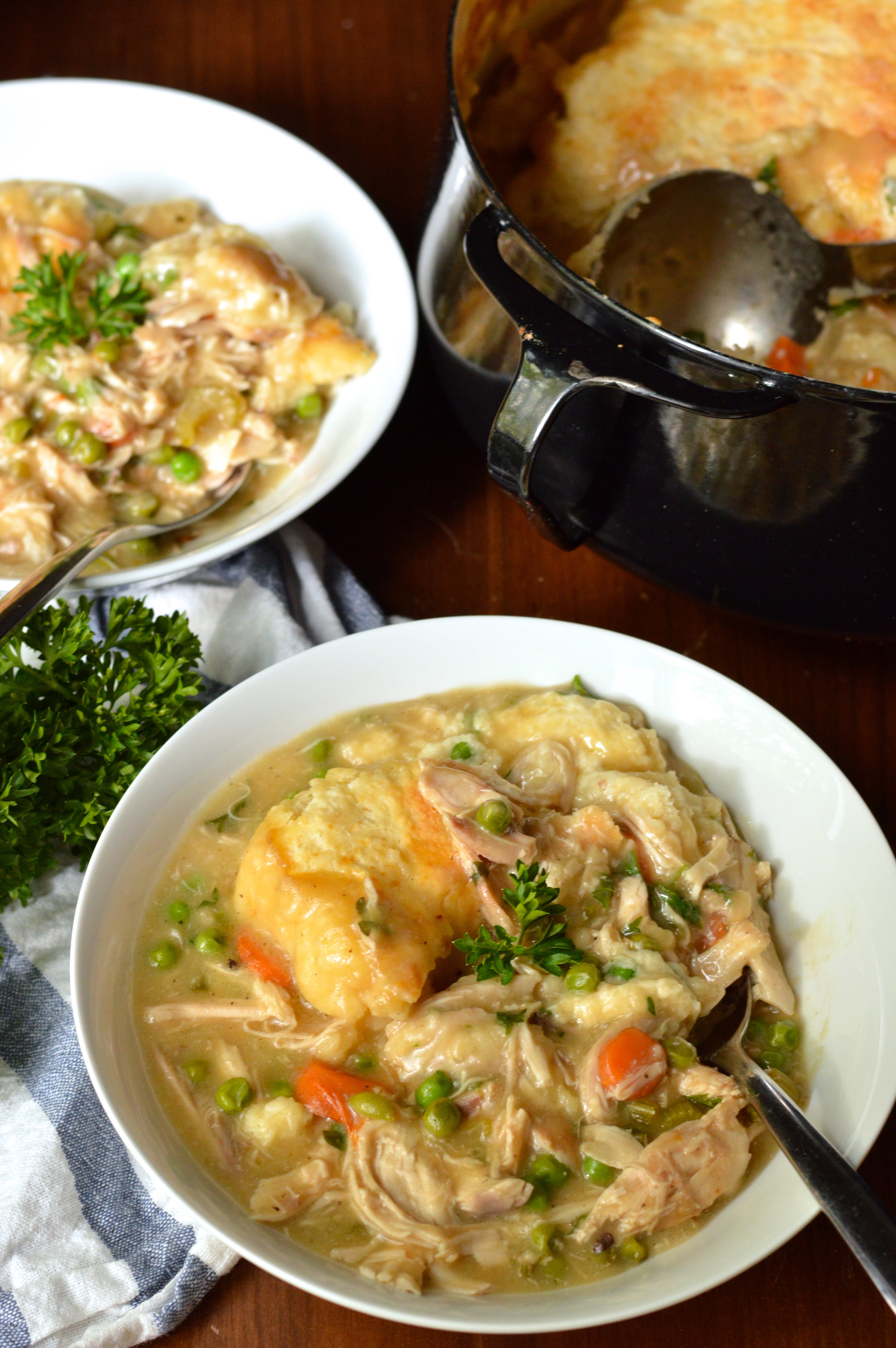 When I was old enough to start cooking my own meals, this was one of the first recipes I was determined to master. Later in life I started experimenting and toying with Grandma’s recipe, and the way I make it today is actually quite different from the way she does. Chicken bouillon cubes have been replaced with homemade chicken stock, canned vegetables scrapped and swapped for fresh, and real buttermilk biscuits take the place of Grandma’s biscuick topping. I believe her recipe originally came from a woman’s magazine with a focus on convenience food, but times and tastes change, and I prefer this fresher, less processed, more modern interpretation.
