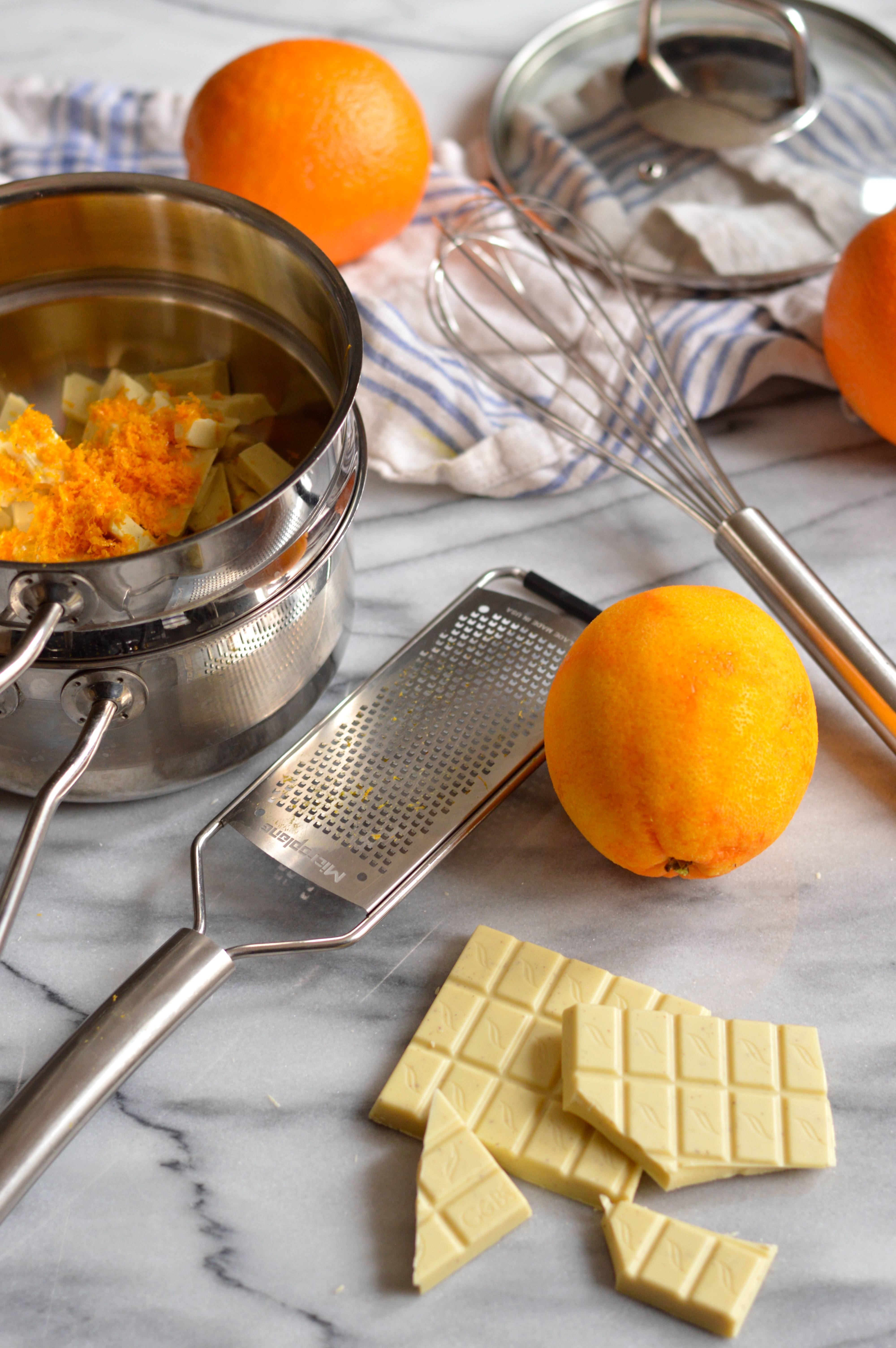 In the the bowl of a double boiler over a very gentle simmer, break up the white chocolate into small pieces and combine with the heavy cream, orange zest, and salt. Stir with a silicone spatula until the chocolate is completely melted with no solid chunks remaining. Take your time, and be sure that the water in the lower pan never goes above a gentle simmer.