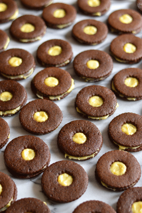 With a small offset icing spatula, or a butter knife, spread a small amount (probably about 2 teaspoons) of the ganache filling on to each base cookie. Top each of the filling-covered base cookies with a top cookie and line the filled cookie sandwiches up in a single layer on a clean surface. Dust all the cookies with a light coating of powdered sugar.
