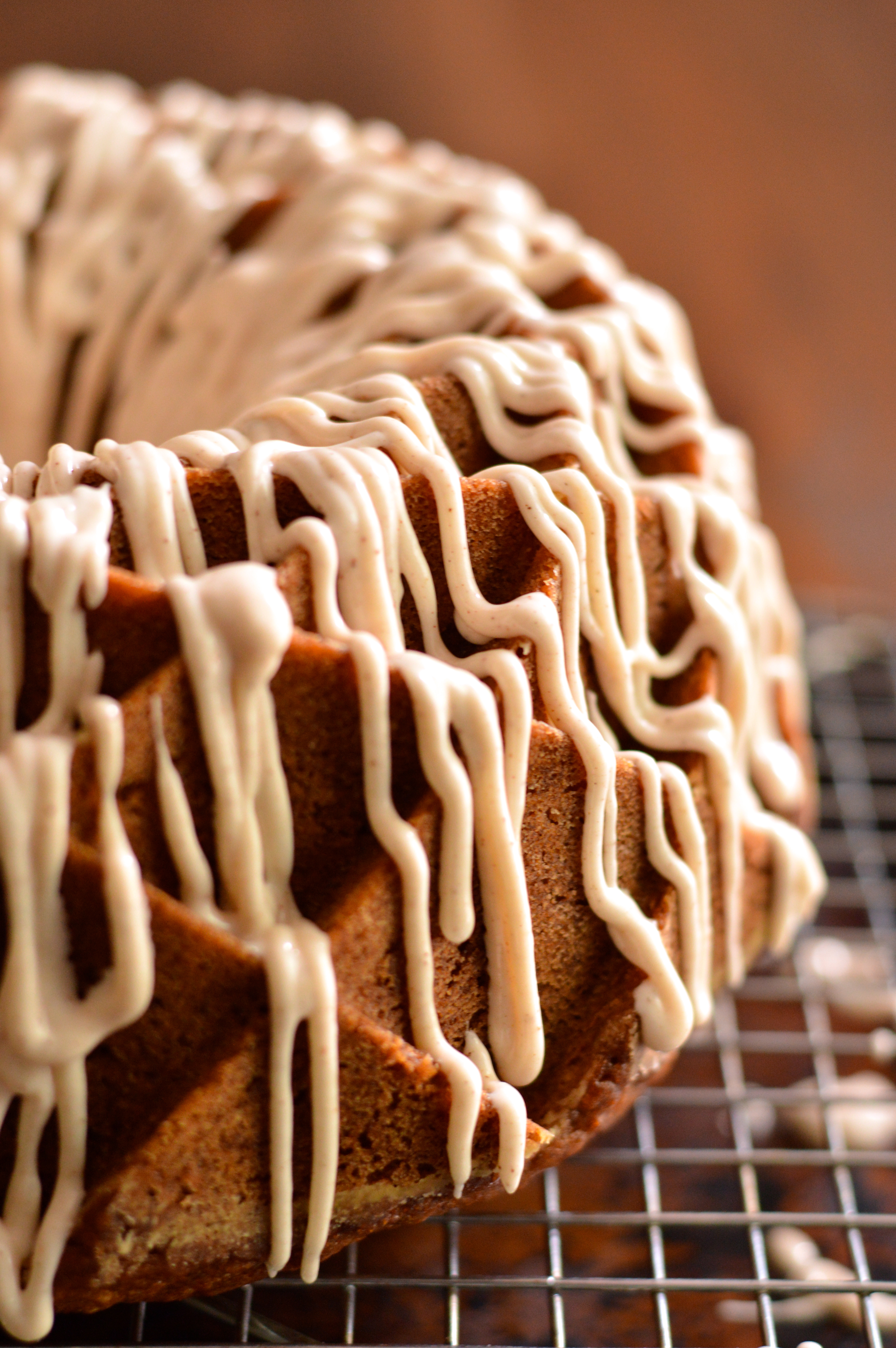 Pour batter into the prepared bundt pan and smooth out the top. Bake for 50-55 minutes, or just until a toothpick inserted in center comes out clean. Let cool for 20 minutes in the pan before inverting onto a cooling rack to remove from the pan. Cool completely before drizzling with glaze.