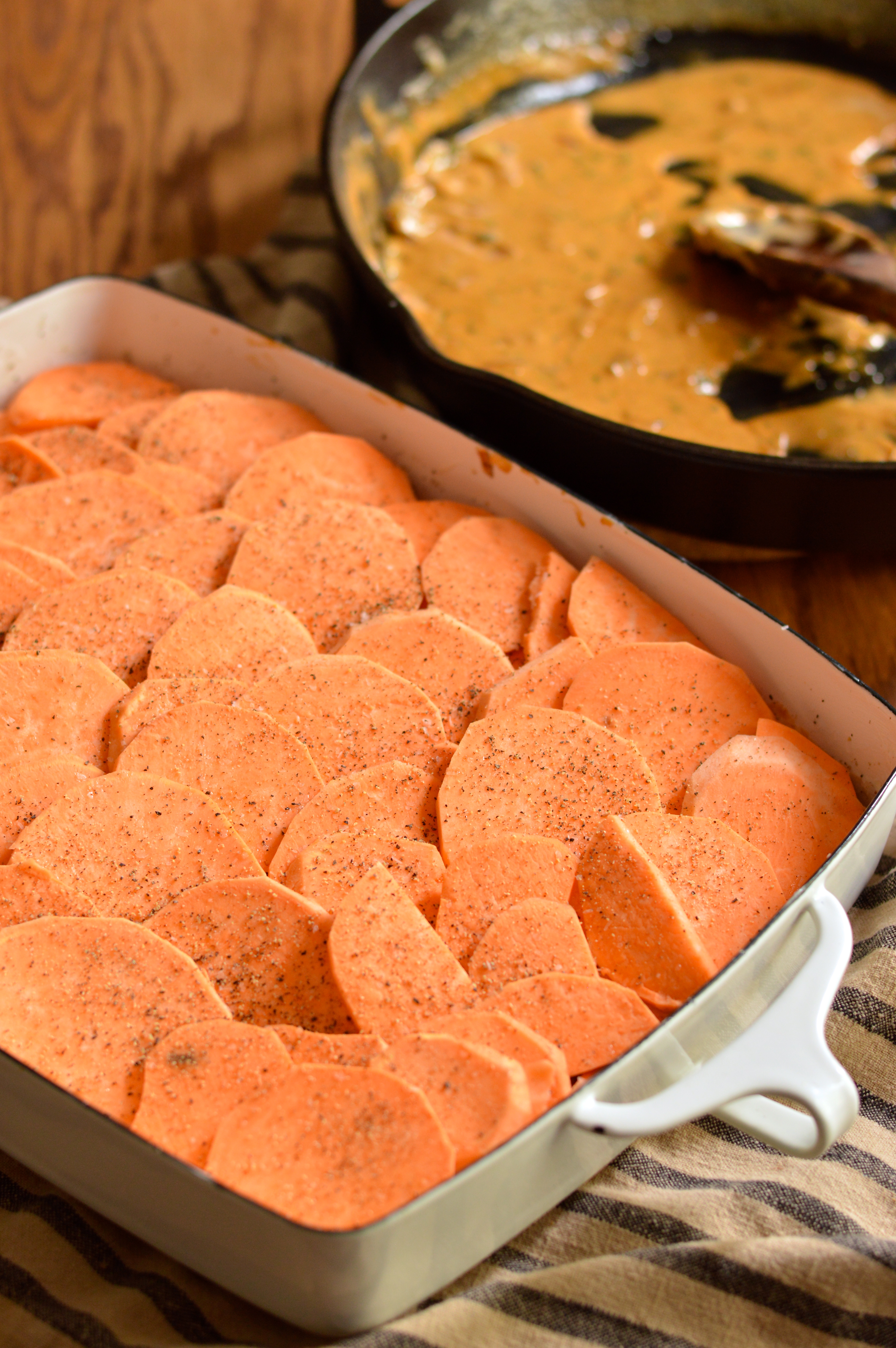 Red, White, & Sweet Potato Gratin with Fennel & Sage