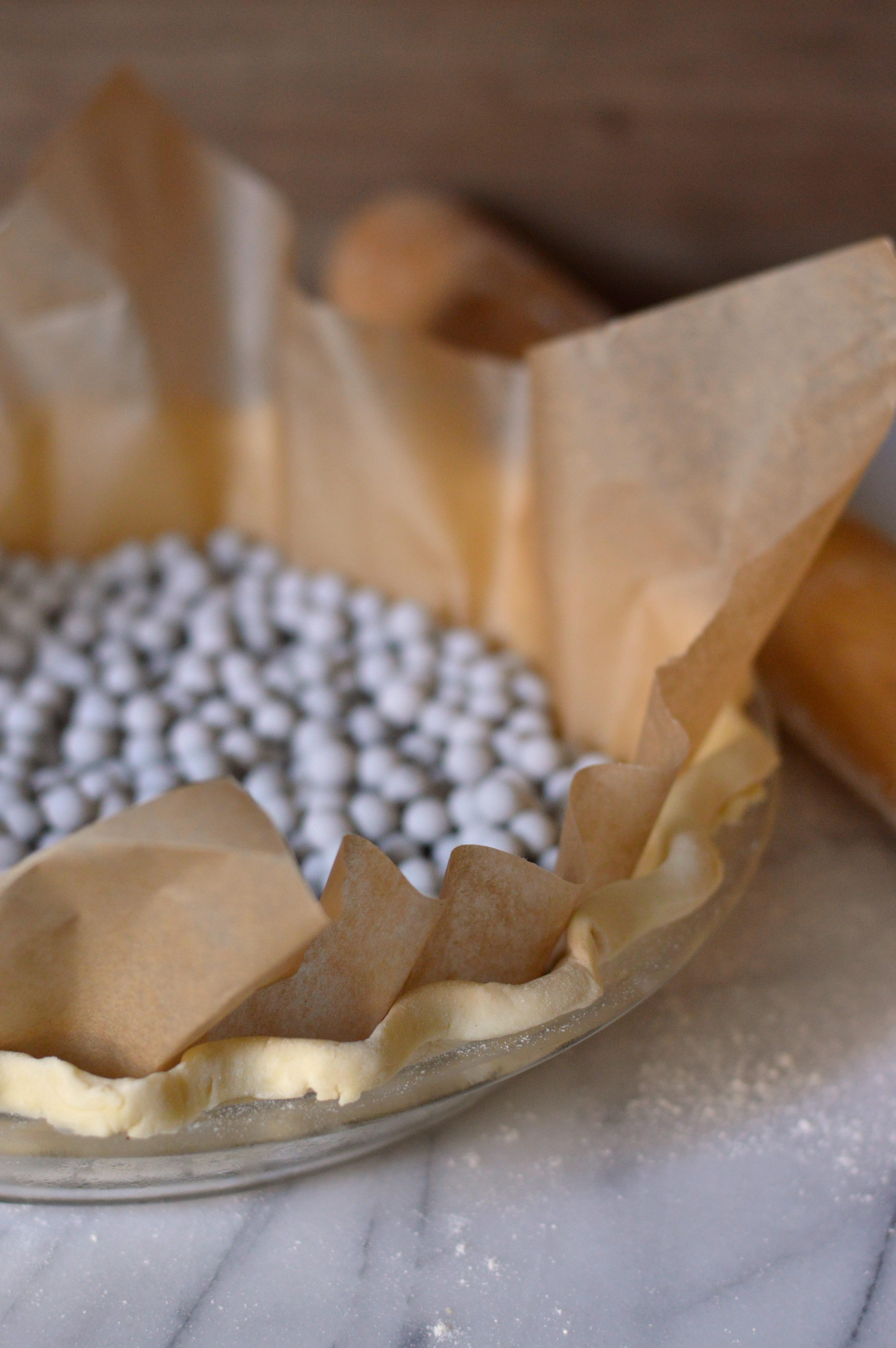 3) Fill the parchment-lined pie crust with plenty of weights or beans, you don’t want to skimp.
