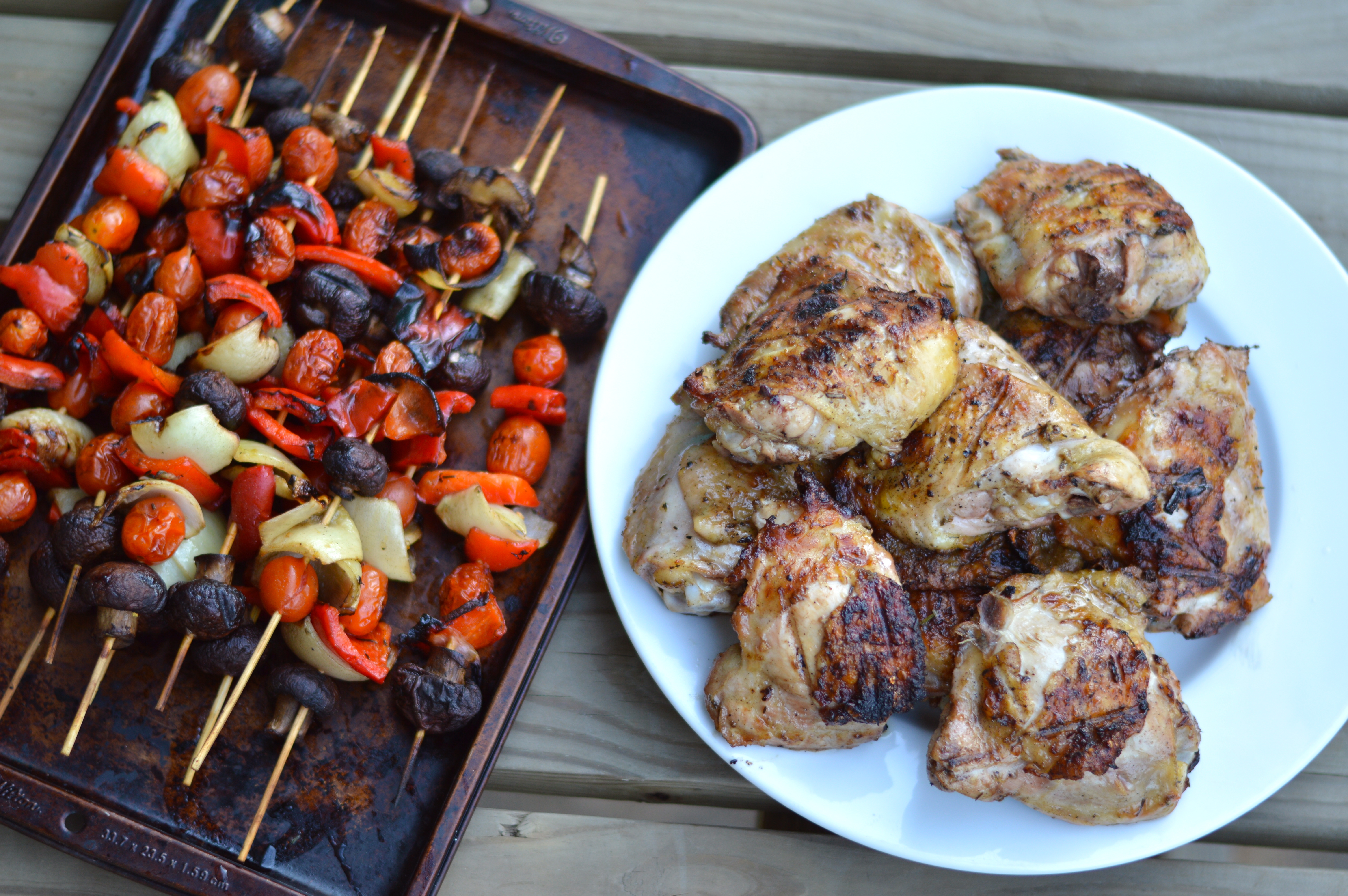 To go along with our chicken, I also grilled some marinated veggie kabobs. A nice mix of grape tomatoes, onions, bell peppers, and mushrooms was just what the doctor ordered. I LOVE the way grape tomatoes get all hot and juicy and just barely hold their shape when you grill them. You can definitely play with other veggies too, but it’s important to keep in mind that they’ll all cook for the same amount of time. Simply cut up your veggies into bite sized chunks (l left my mushrooms and tomatoes whole), marinate for an hour or two, arrange on skewers, and cover until you’re ready to grill. If you’re using wooden skewers you should soak them in water while your veggies marinate so they don’t burn on the grill. As for marinades, I think vinaigrettes work really well for grilled vegetables, but you can really use whatever you like. In this case, I just made a little extra lemon herb marinade and used that.