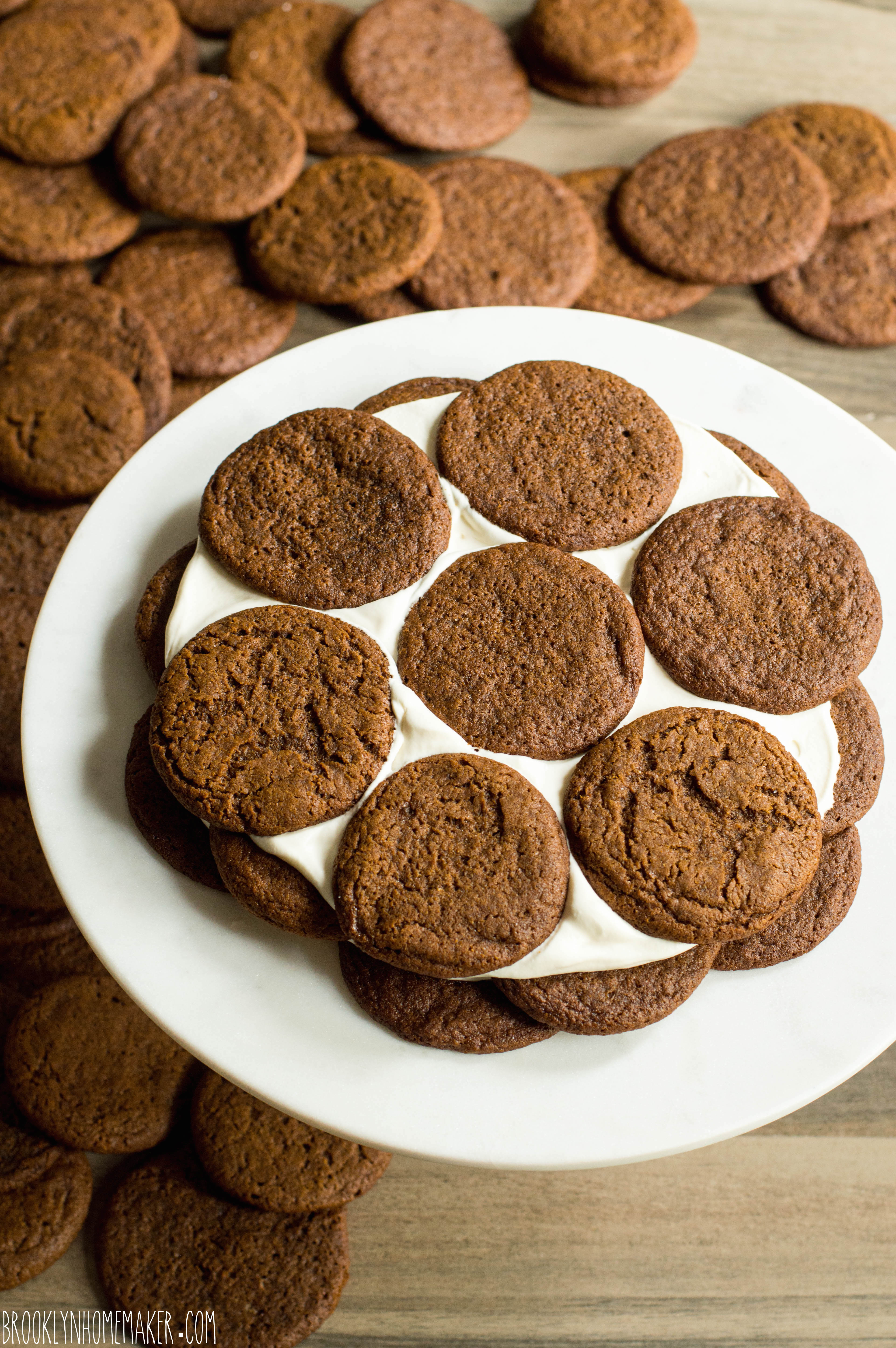 So I thought that a gingersnap icebox cake was just the ticket to kick off the holiday baking season. Like I said before though, I don’t really do “easy”. I know I set out to do an easy dessert, but once I got inspired and excited I decided that it would be more fun to make my own gingersnaps rather than using store bought. This is totally unnecessary, but I’m a weirdo so I totally enjoyed the process. If you do want to make your own though, I’d suggest using a little extra ginger in the cookies. The spice is mellowed out a bit by the cream so a little extra will kick it back up to where you’d expect a gingersnap to be.