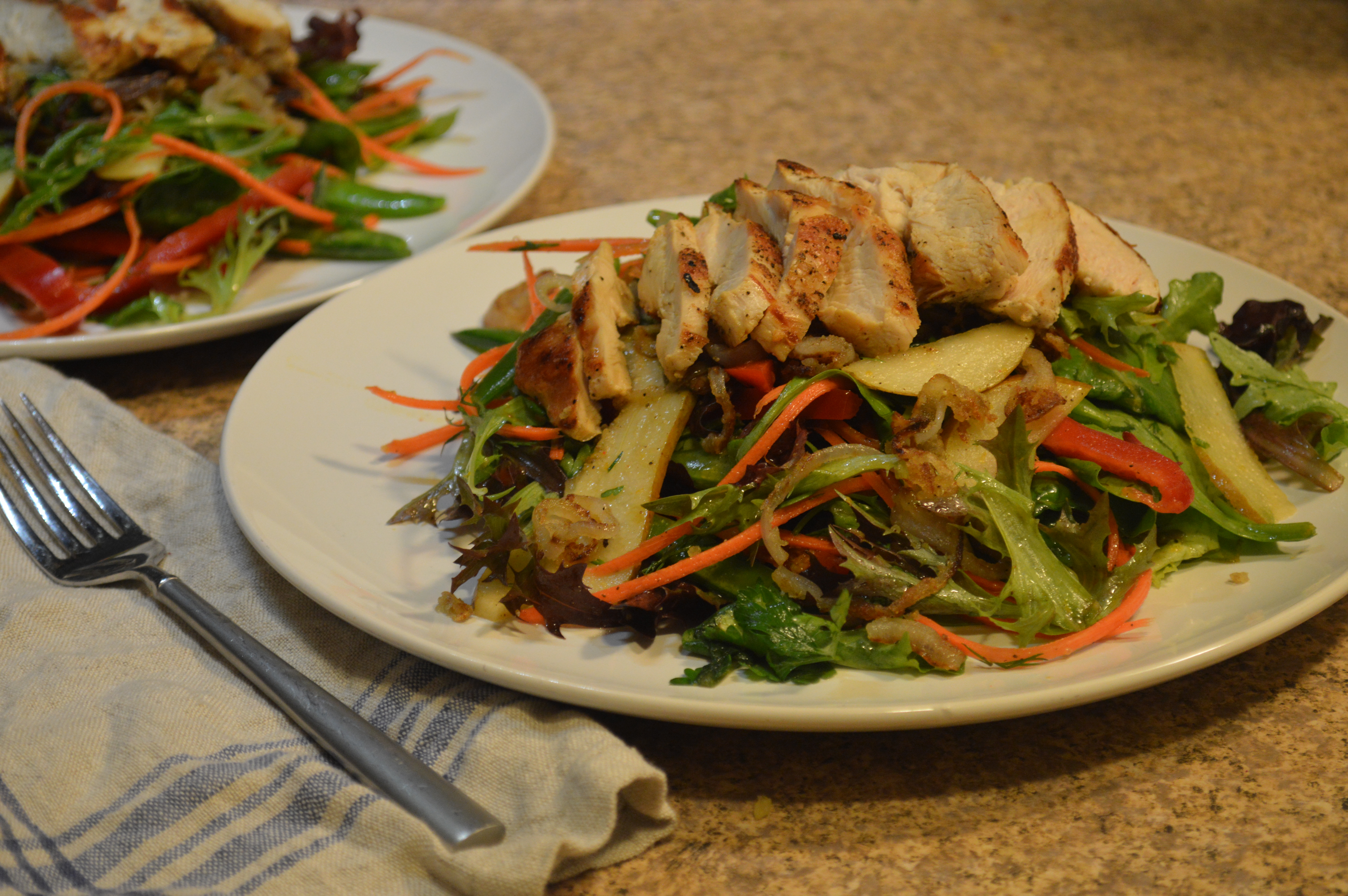 Combine all salad ingredients in a large bowl and gently toss with about half the dressing. Try not to completely mix in the goat cheese or it’ll kind of just disappear. If you’re happy with the amount of dressing, you’re done. Otherwise, add a bit more until you’re satisfied, and gently toss again. Divide between serving bowls or plates and enjoy.