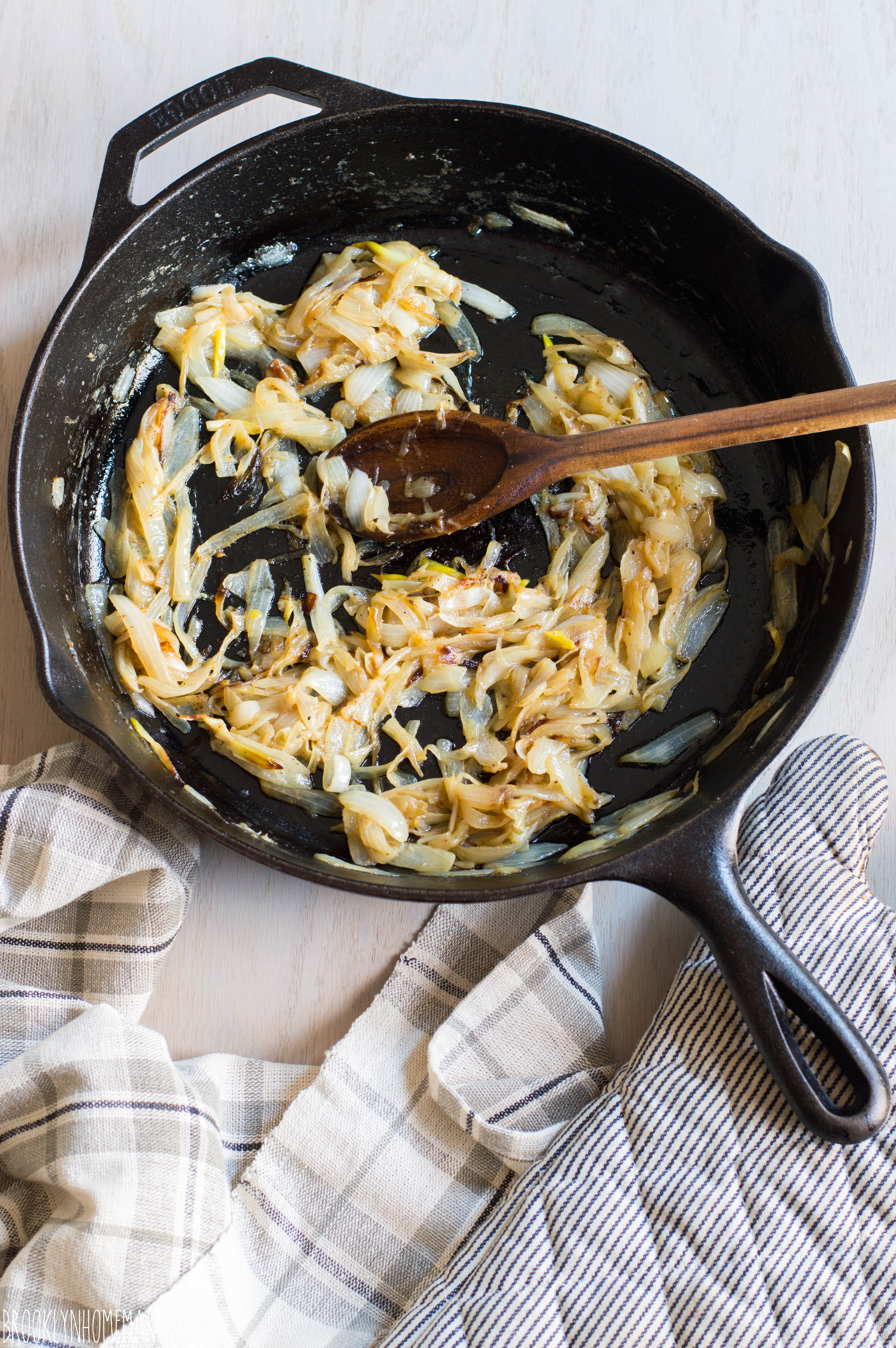 Heat 1 tablespoon olive oil and 2 tablespoons butter over medium heat in a large skillet. Add thinly sliced onions and season with salt and pepper. Once the onions begin to soften turn the heat down to medium low and let them caramelize slowly, stirring occasionally, for about 3o to 45 minutes. This takes a long while but you want the onions to brown very slowly to bring out their sugars and intensify their flavor.