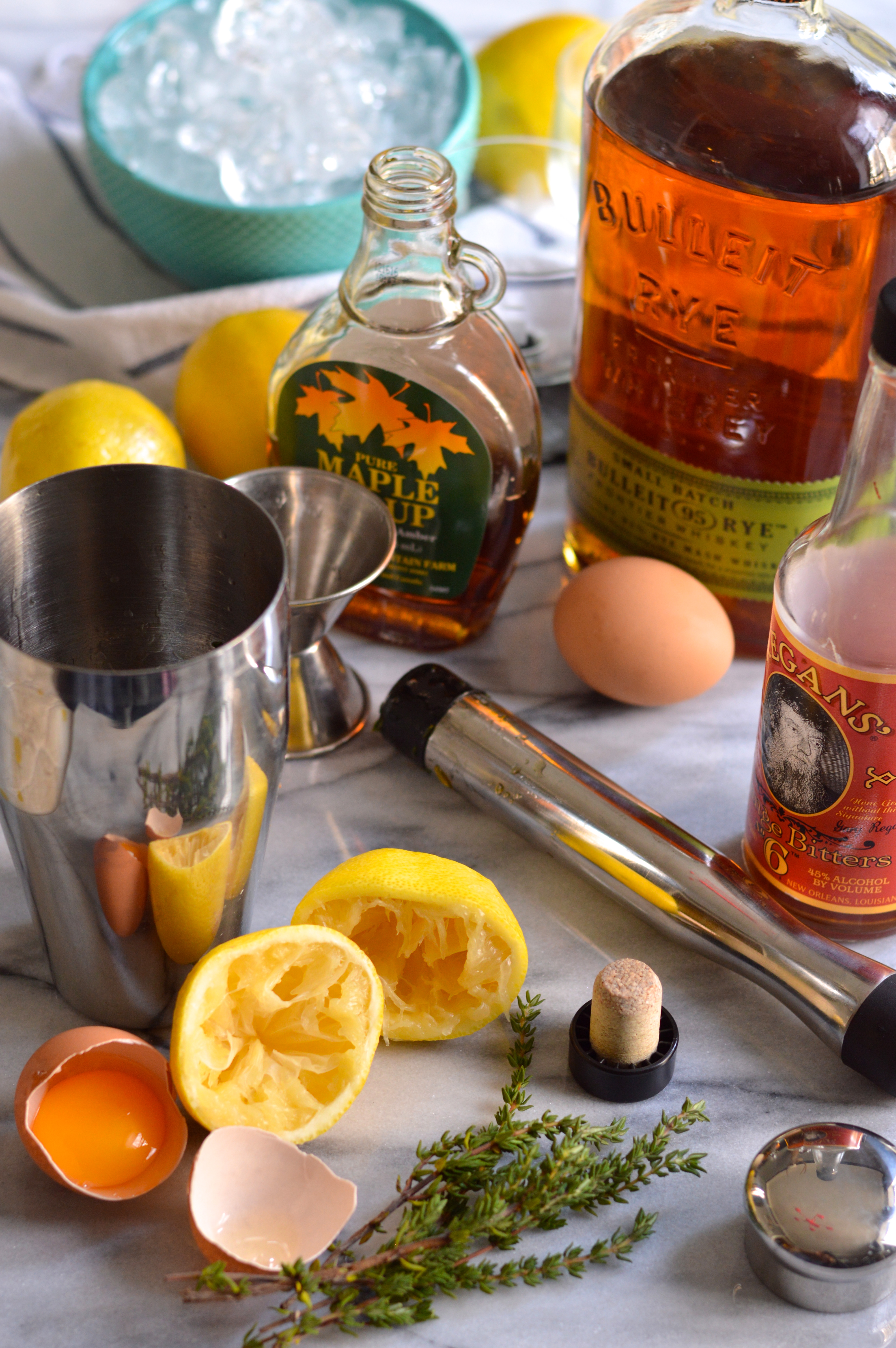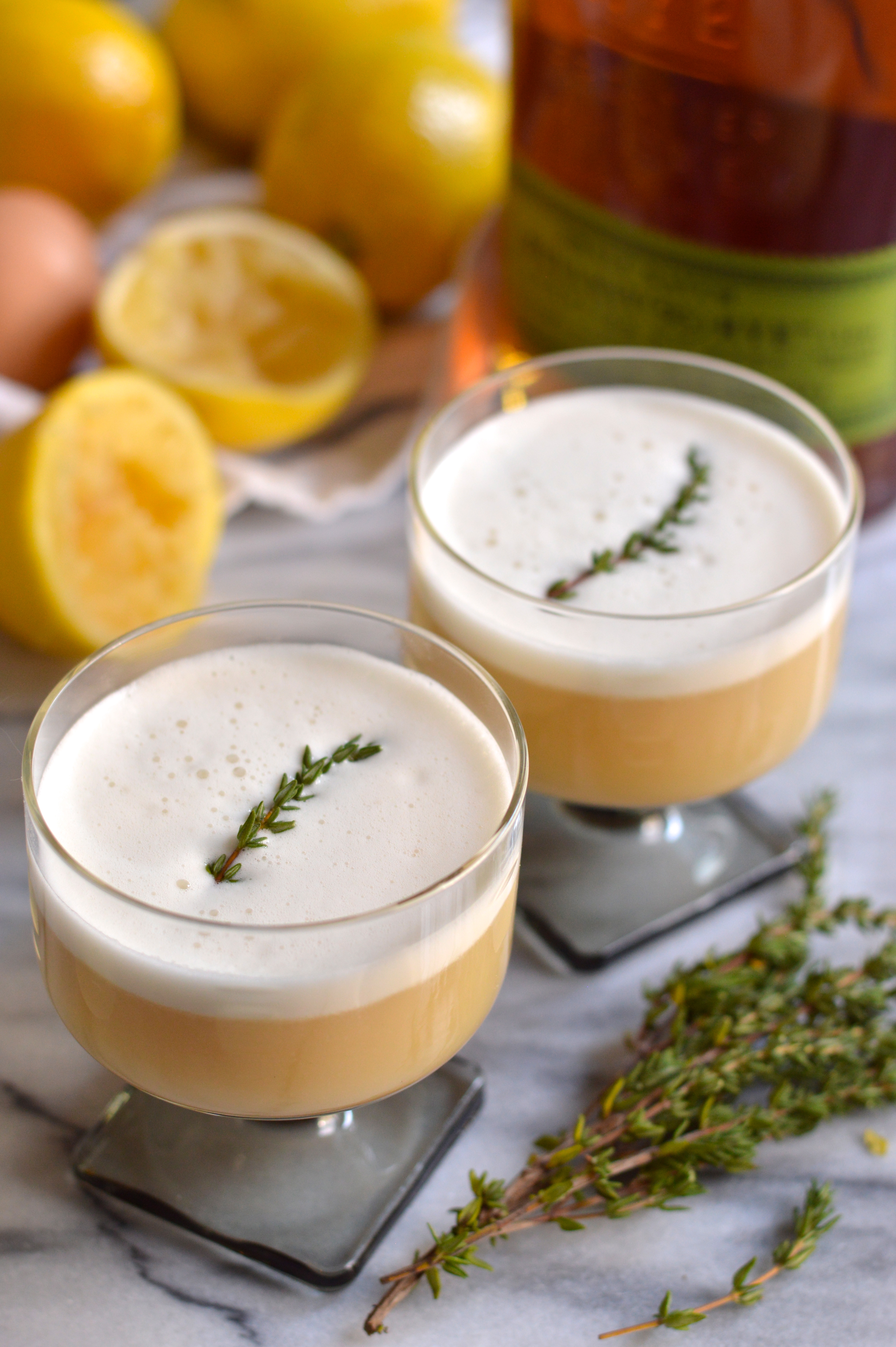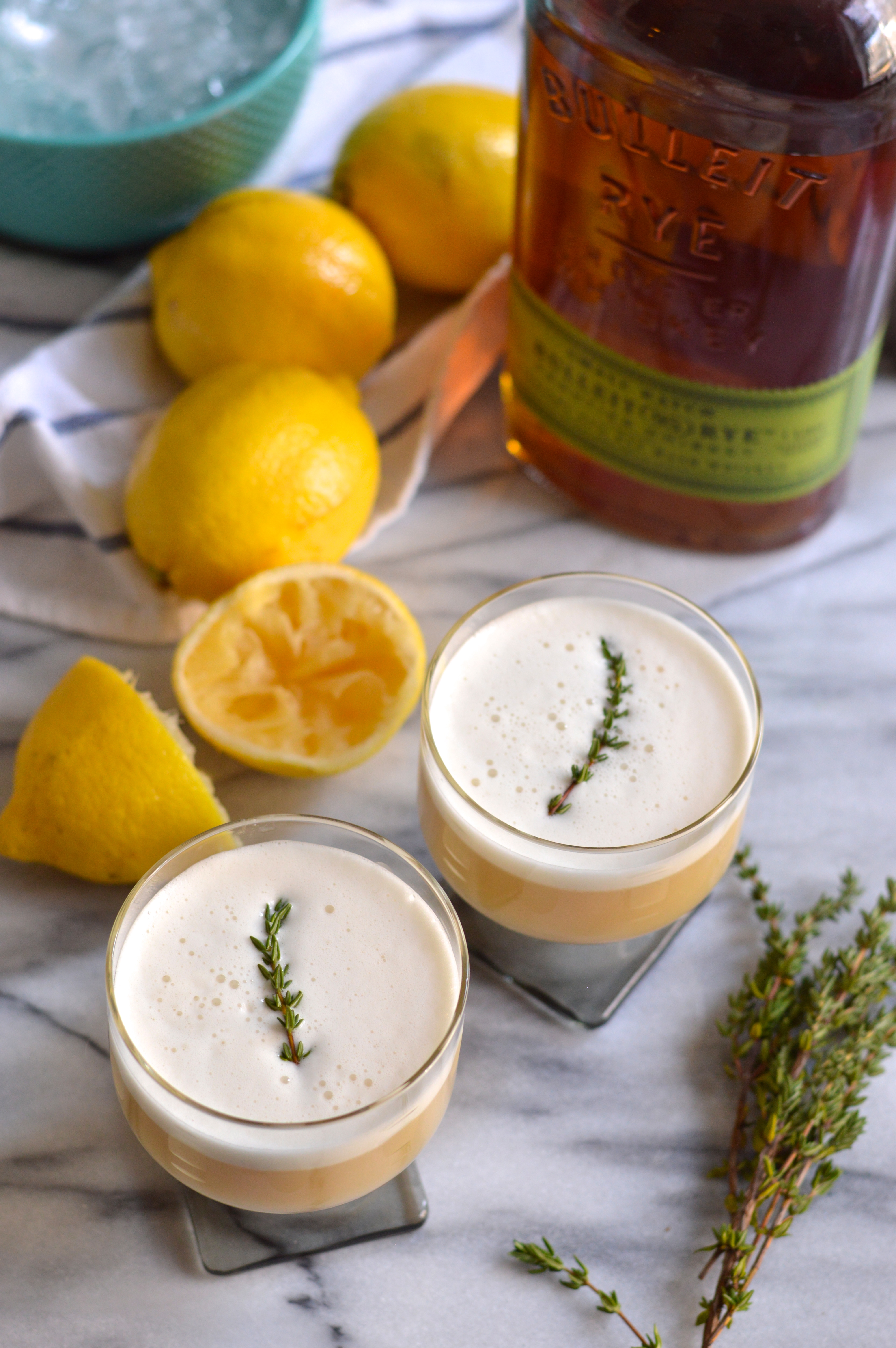 Russell and I love a traditional (stiff) whiskey sour with lemon juice, superfine sugar and plenty of good American whiskey. I like to use rye because I think it’s more assertive flavor stands up better against the citrus in this drink, but bourbon would definitely work well too if that’s what you prefer. Fresh egg whites are shaken into this classic cocktail to add the signature foamy creaminess that whiskey sours are known for. I always try to buy eggs that come from cage free local farms, so I don’t worry too much about the fact that the whites in this drink are raw, but if you’re concerned about food safety, most grocery stores carry little cartons of pasteurized egg whites that you can use instead.